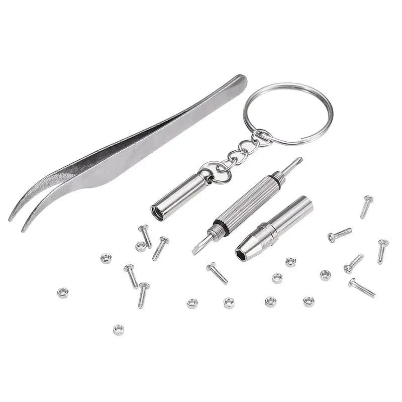 Материал: нержавеющая сталь, пластикМожет использоваться для ремонта или завинчивания винтов для очков, солнцезащитных очков, часов, мобильных телефонов и других точных устройств.4 в 1 отвертка: отвертка с плоской головкой/отвертка Phillips/отвертка со Звездной гайкой/брелок.Чехол Размеры: (приблизительно) 109*64*15 мм; Общая Длина отвертки (без брелок): около 6 см; Брелок Диаметр: около 2,3 смЭтот набор инструментов используется для фиксации очков или часов. Оснащенный коробкой из 1000 небольших винтов и отверткой 4 в 1, этот набор инструментов поможет вам закрепить ваши очки и часы полезным способом.Вес: около 74 гКоличество: 1000 штЦвет: сереброОтвертка Особенности:Эта многофункциональная отвертка широко применяется для ремонта очков и часов.С брелком, портативный и легко повеситьВинт Тип:Острый наконечник1,0*3,6 винт2,0*2,4 винт2,0*2,6 винт2,0*2,8 винт2,0*3,0 винт2,0*3,2 винт2,0*3,4 винт2,0*3,6 винт2,0*3,8 винт2,0*4,0 винт2,0*4,5 винт6,0 Pad8,0 со стразами4 в 1 отверткаПосылка включает в себя:1000 x аксессуары для очков1 х Отвертка1 х пинцетКоробка-1 шт.Только вышеуказанная посылка, другие товары не включены.Примечание: светильник и различные дисплеи могут привести к тому, что цвет товара на картинке немного отличается от реального. Допускается погрешность в измерениях +/- 1-3 см.