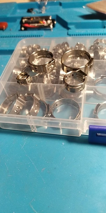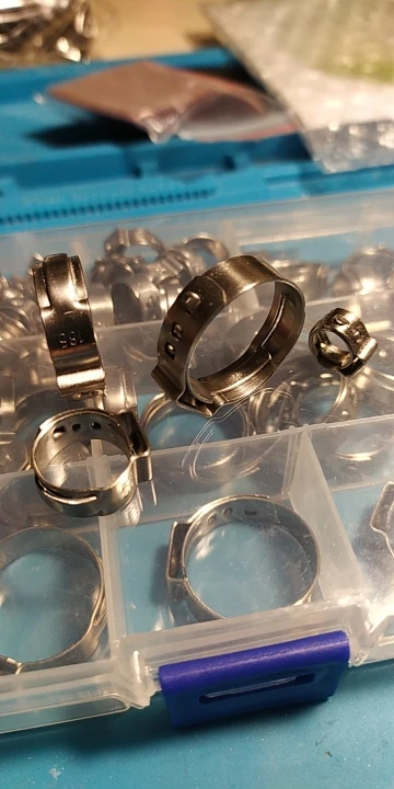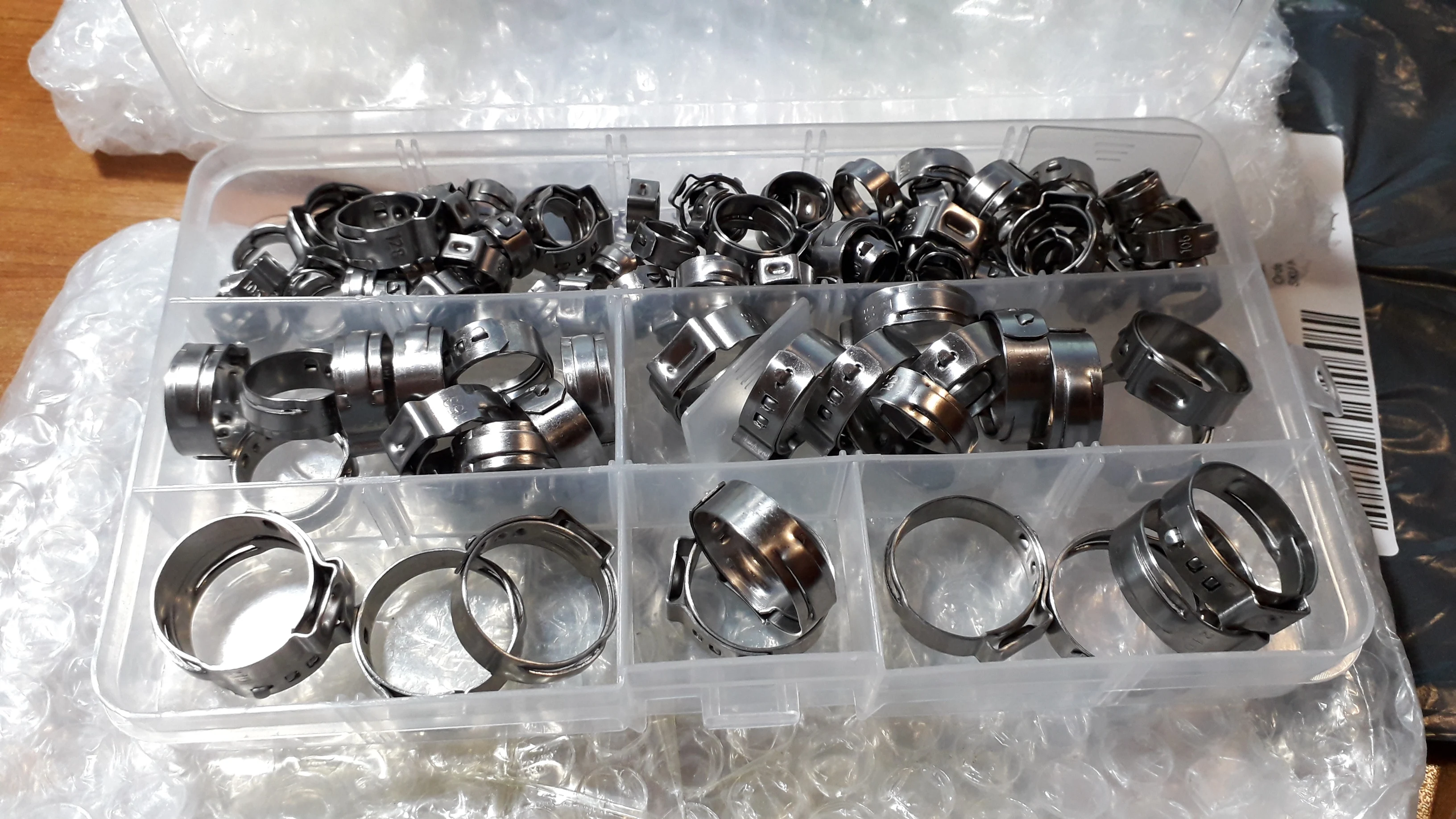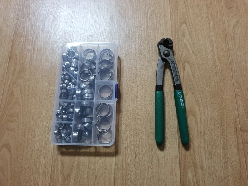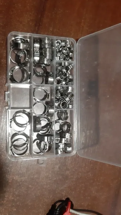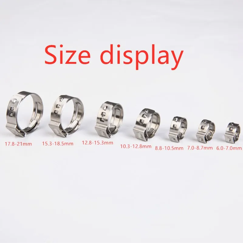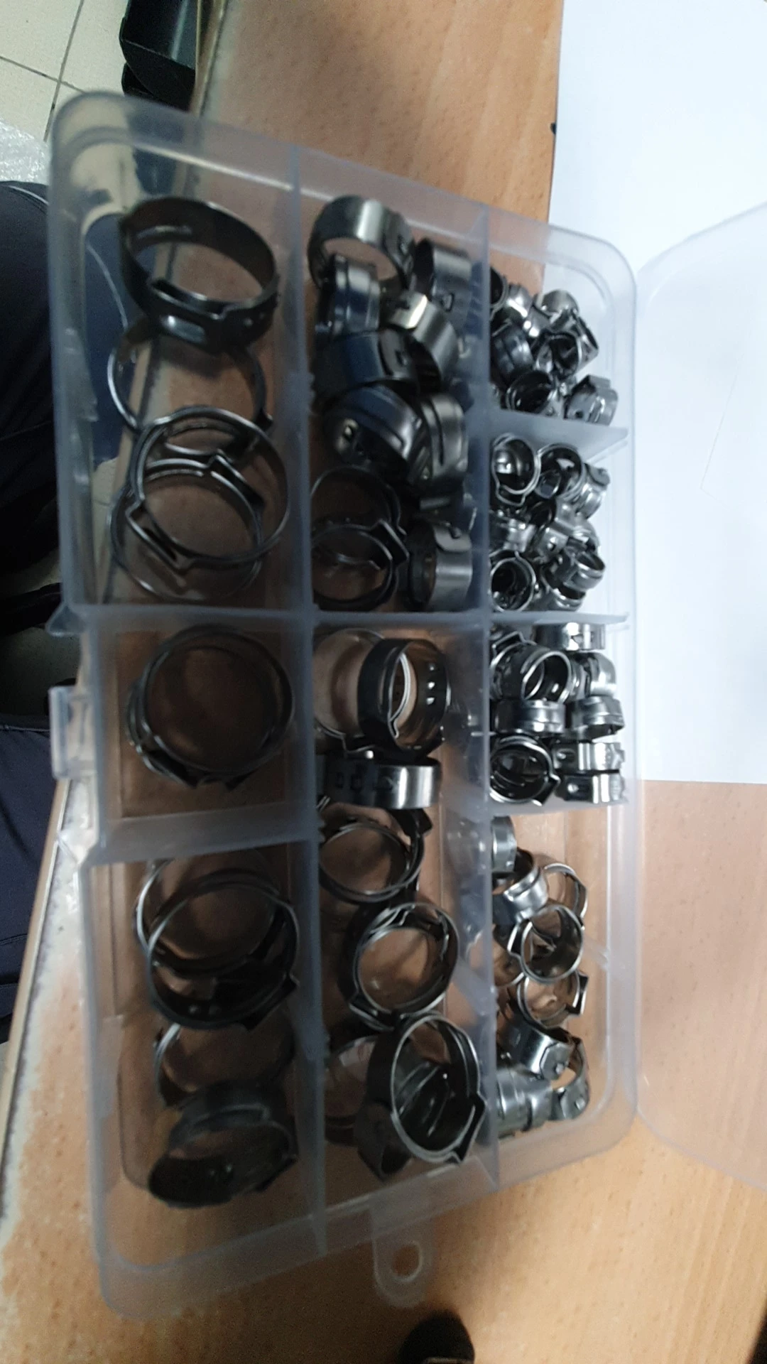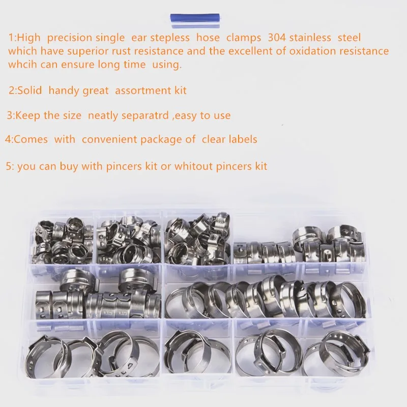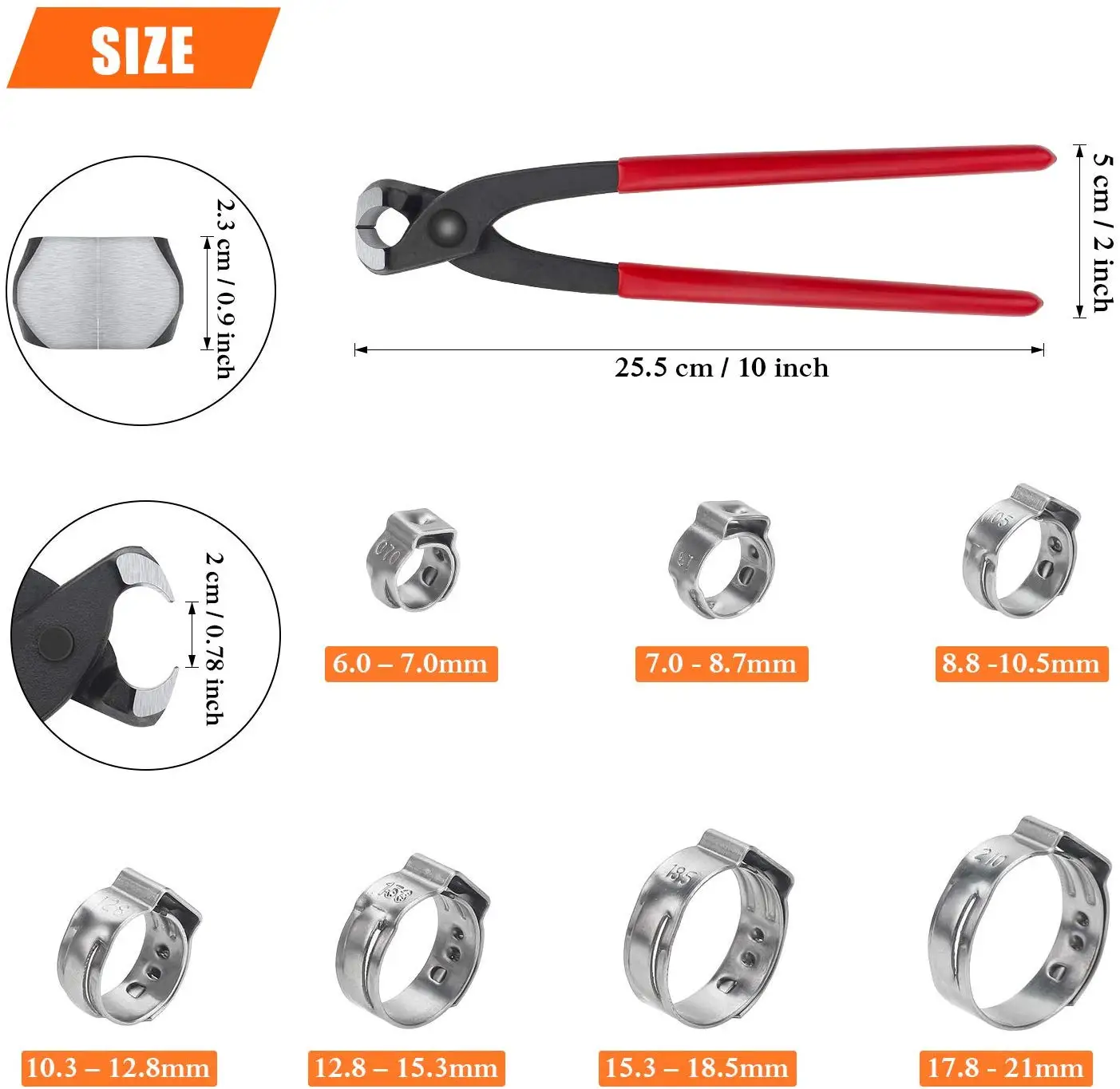 Хомуты для шлангов, 6-21 мм, из нержавеющей стали 100, с одним ушком, бесступенчатые, с набором клещей, 304 шт.