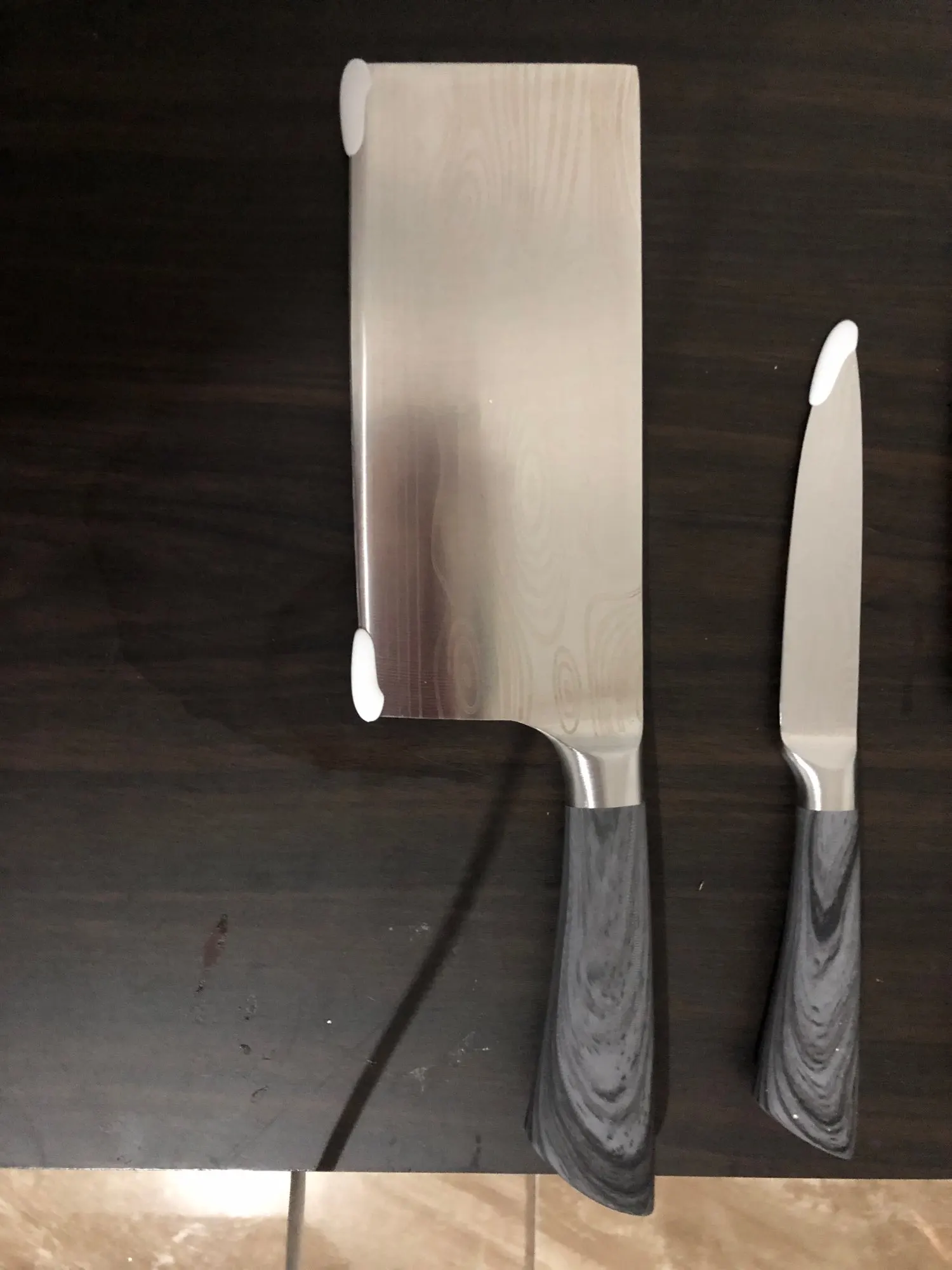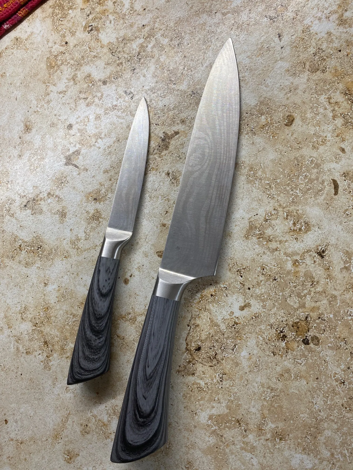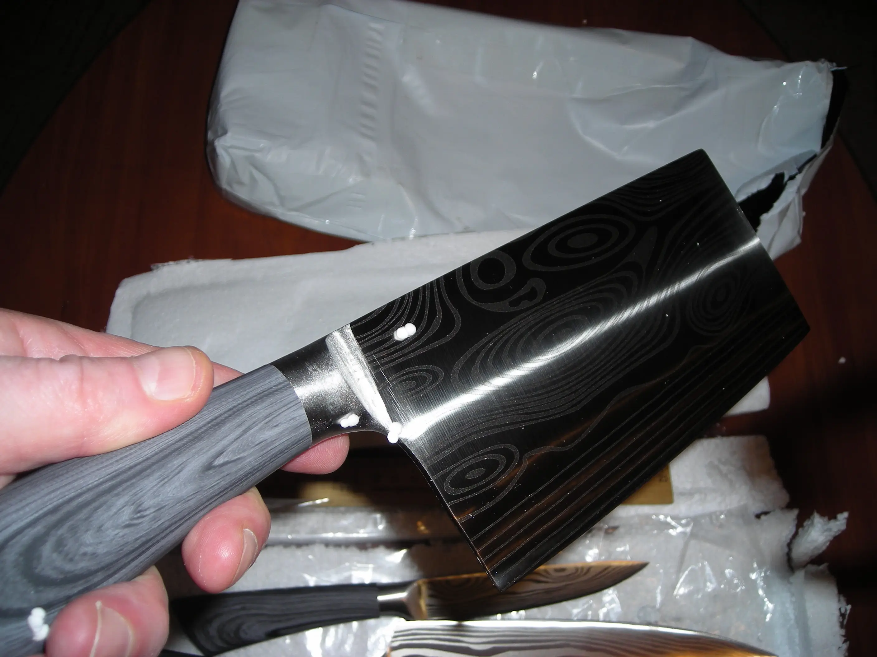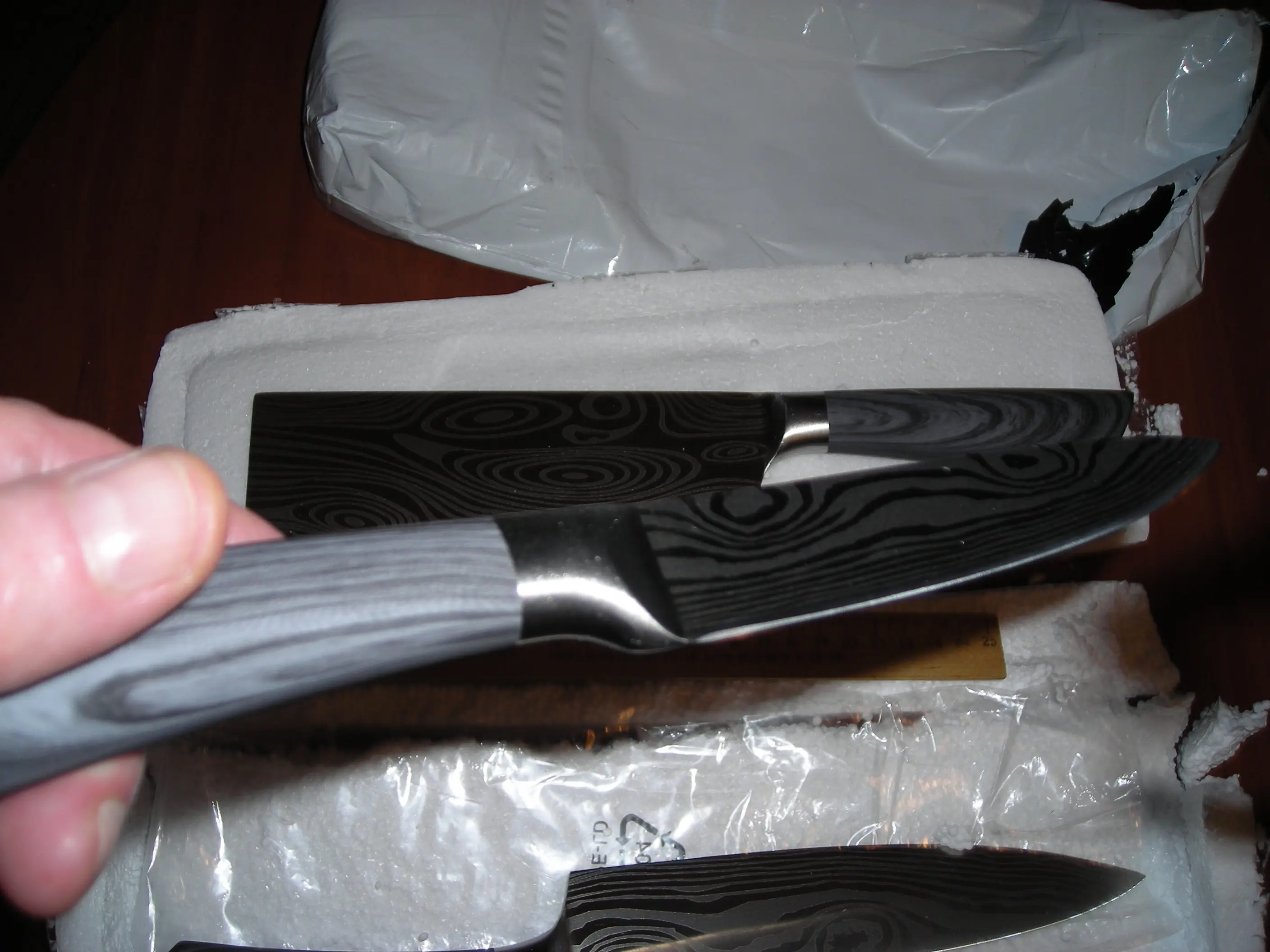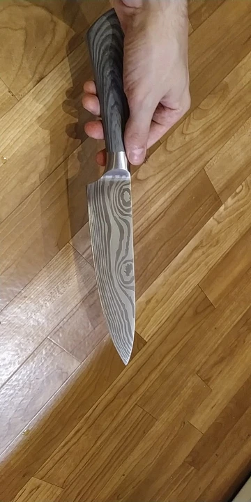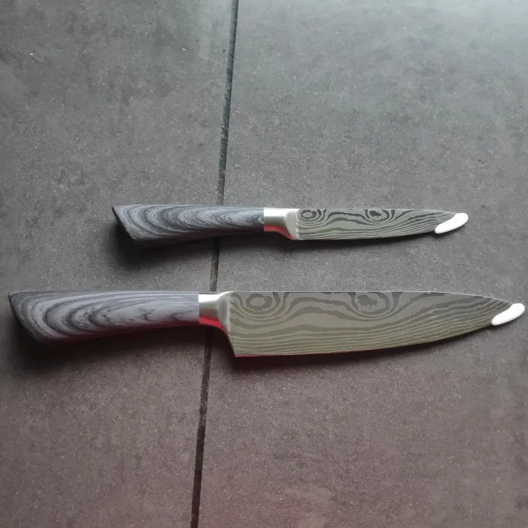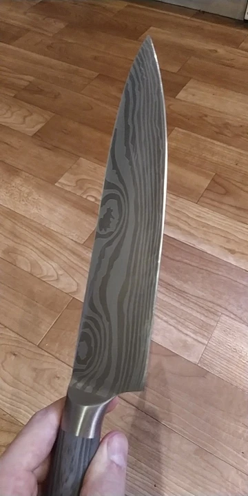 доставка до Києва- більше місяця. упаковано надійно. ножі дуже красиві та акуратні. текстура рель'єфна. ножі дуже легкі, порівняно з моїми стандартними значно лекші. але жуже гострі. ріжуть чудово, помідор першим попав під роздачу- нарізався ідеально тонкими шматочками. побачим як довго така заточеність протримається.
