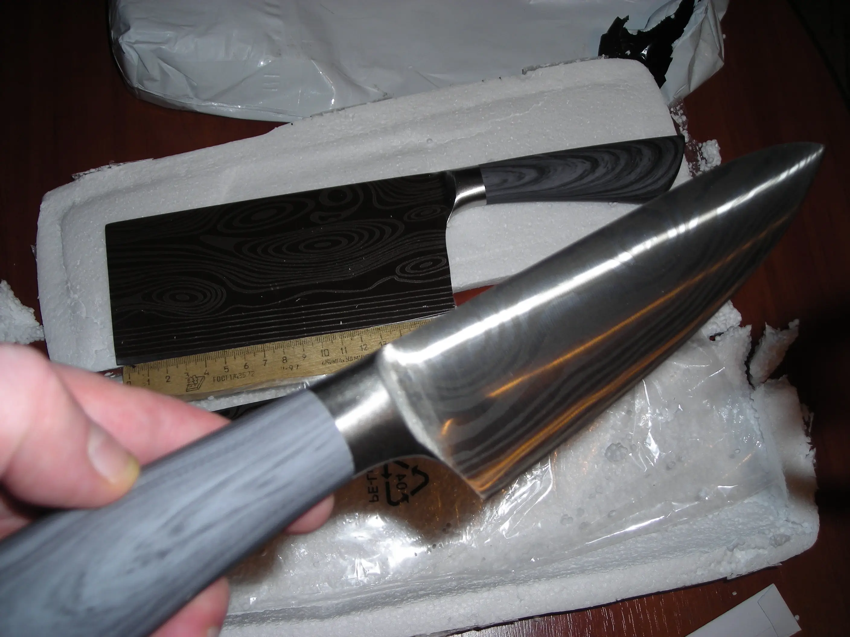 Большое спасибо продавцу,посылка пришла в целости и сохранности.Упакованна в пеноплостовую коробку и каждый нож картонную бумагу и целофановый мешочек,также острые концы заделанны пластиком типа чехла.Ножи острые,ещё раз большое спасибо,всего Вам найлучшего.