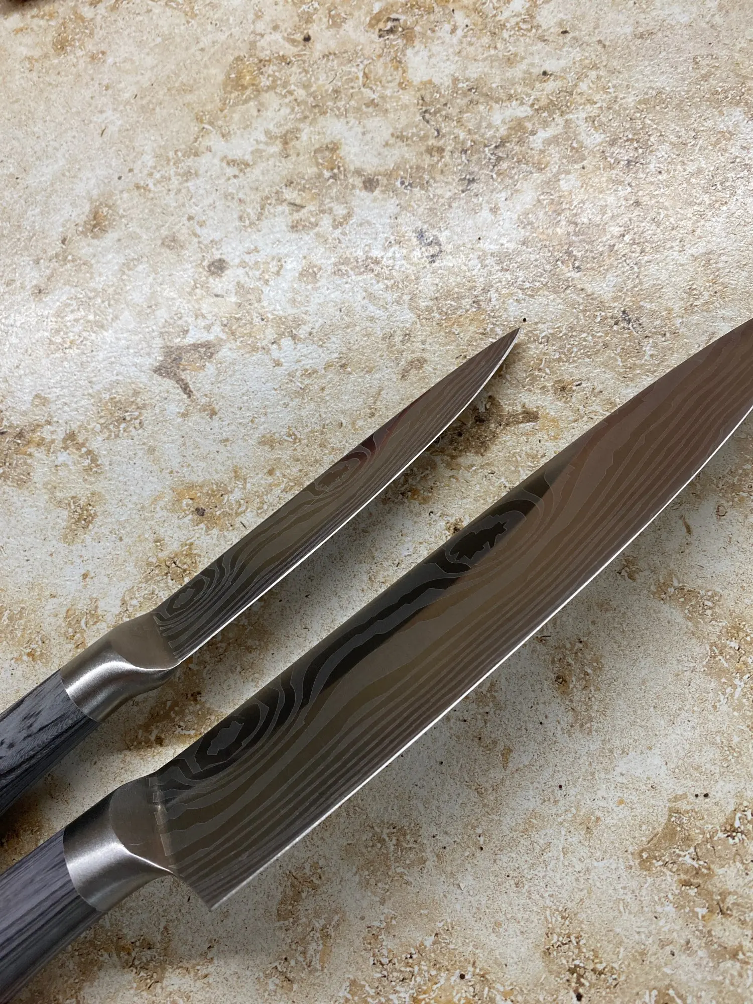 Рекомендую продавца, не общалась, заказ пришёл за три недели, упаковано прилично и что приятно:доставила яндекс-доставка до дома! Ножи лёгкие, ооочень острые, лезвие с красивым рисунком, у рукояток плавный переход на само лезвие. На кухне эти ножи прижились))