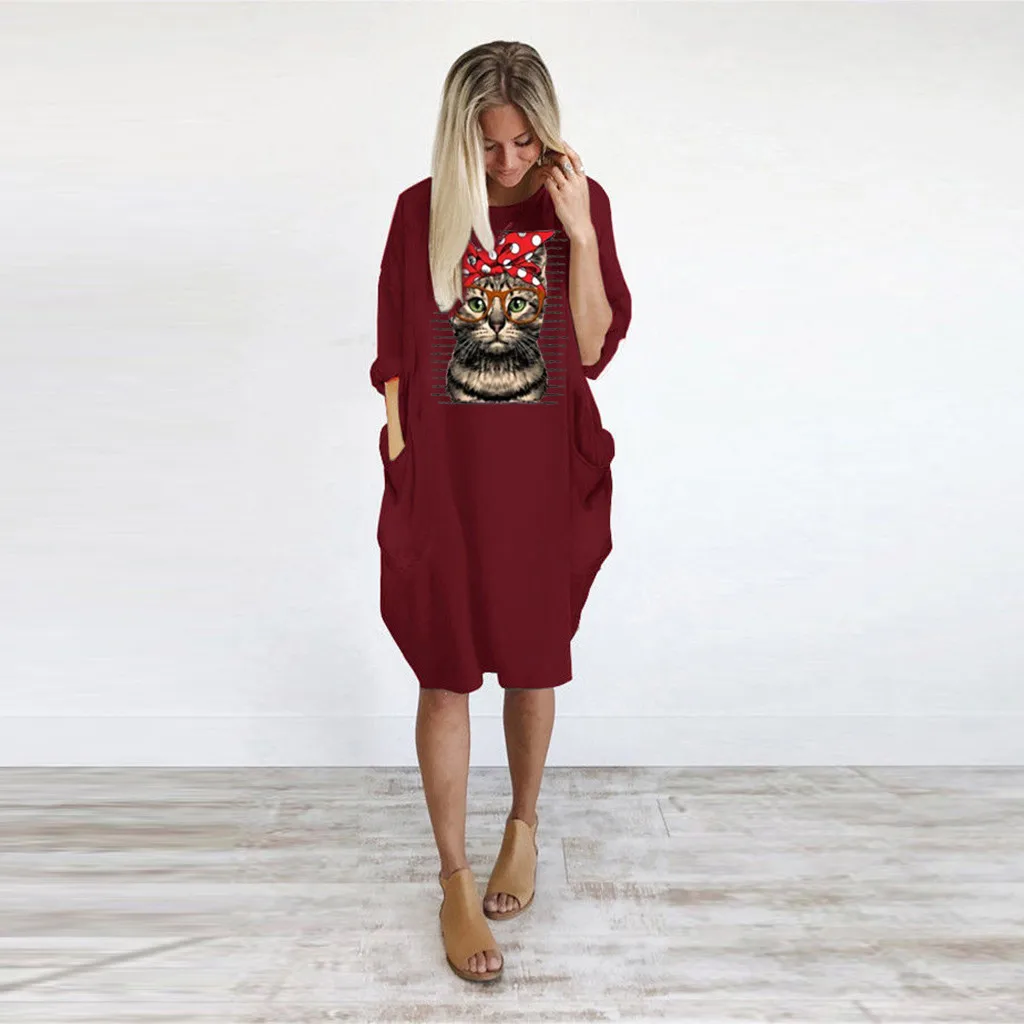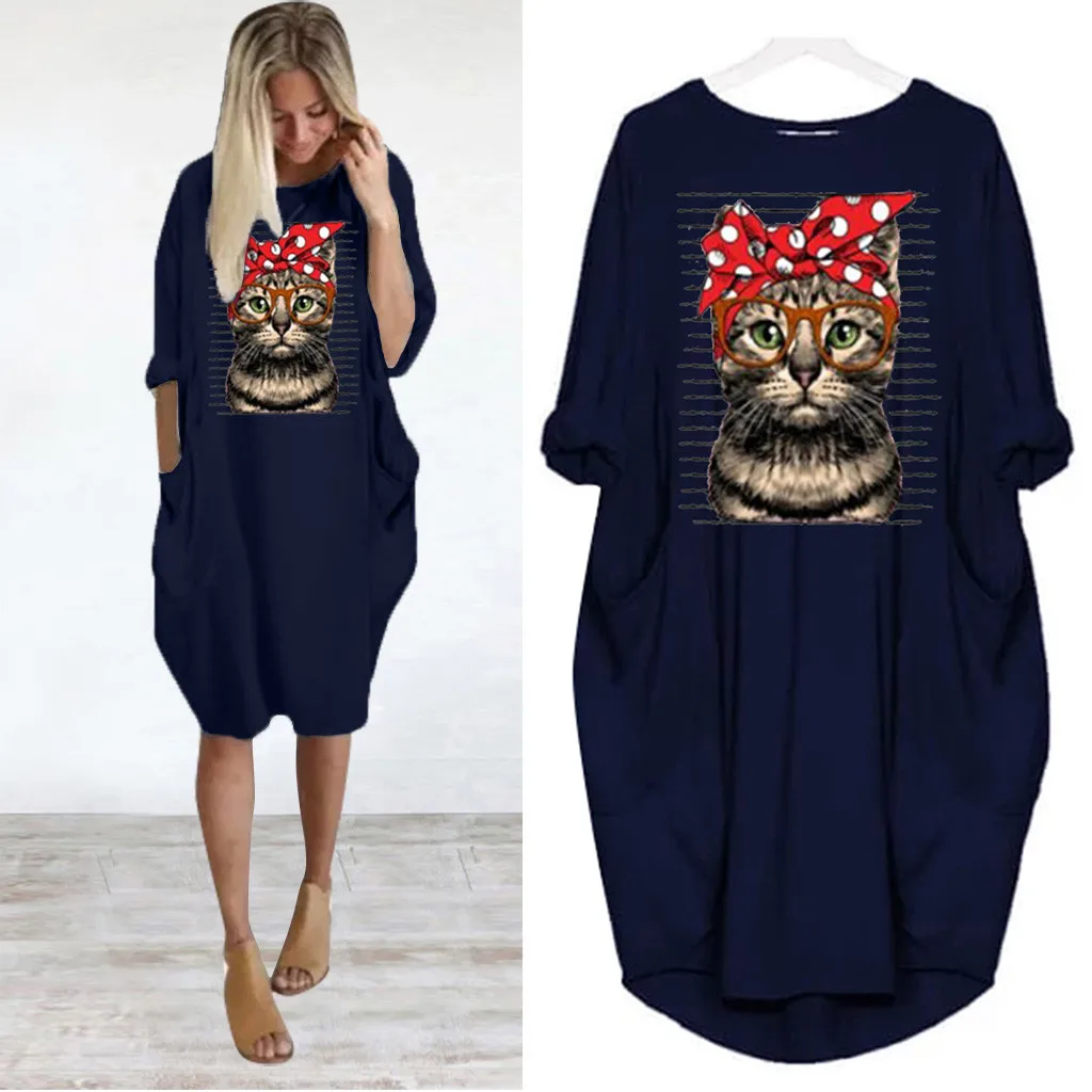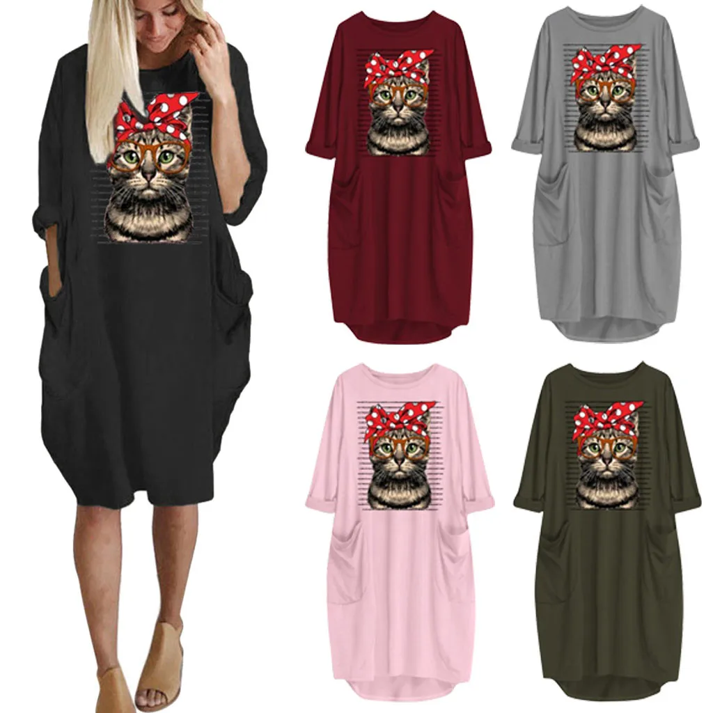 Женское платье с принтом кота 35, свободное повседневное длинное платье с карманами и круглым вырезом, размера плюс-зимнее платье на весну-осень