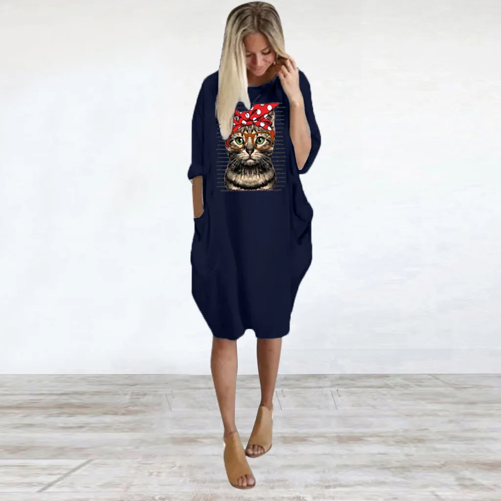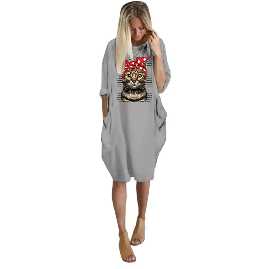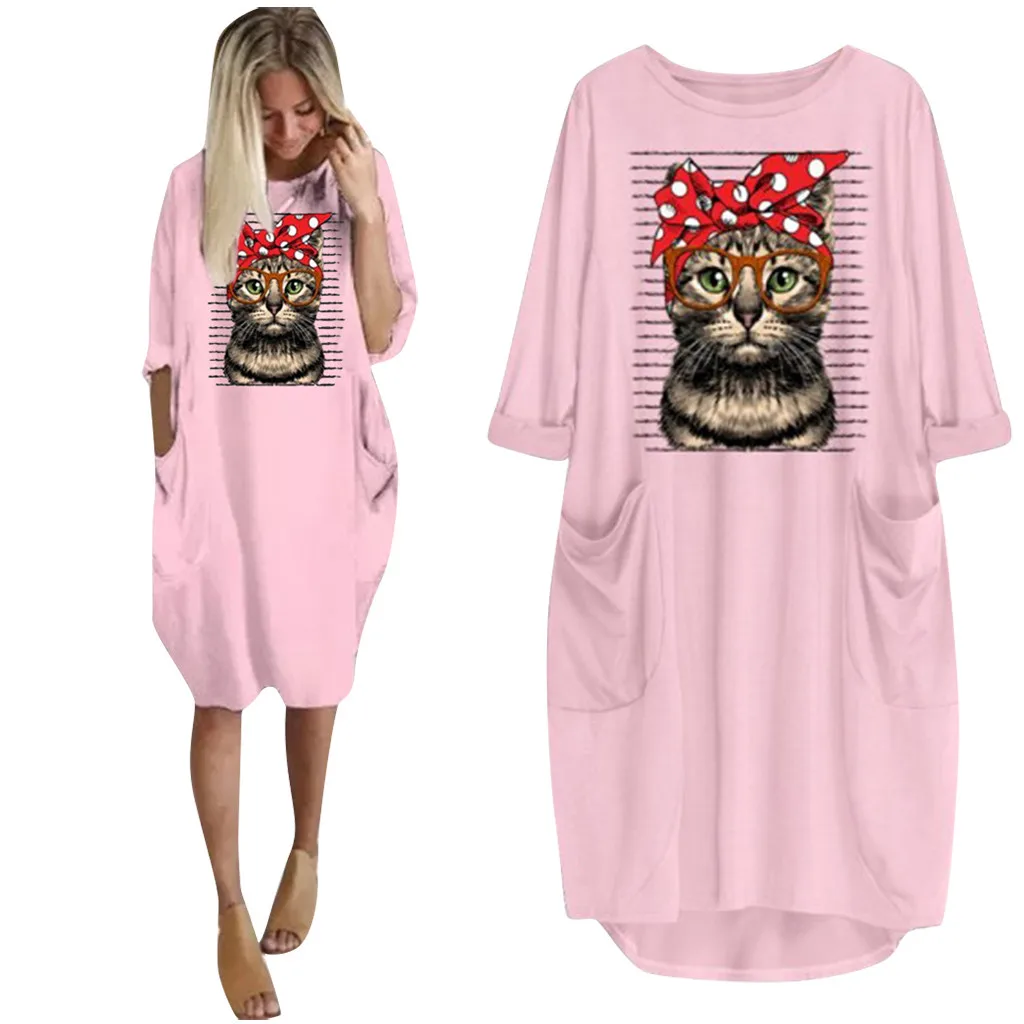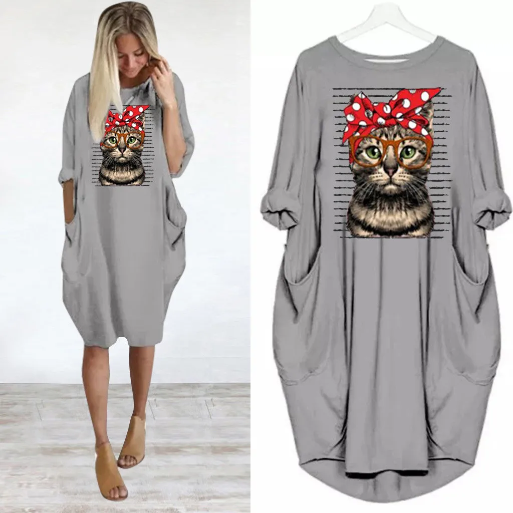 Женское платье с принтом кота 35, свободное повседневное длинное платье с карманами и круглым вырезом, размера плюс-зимнее платье на весну-осень