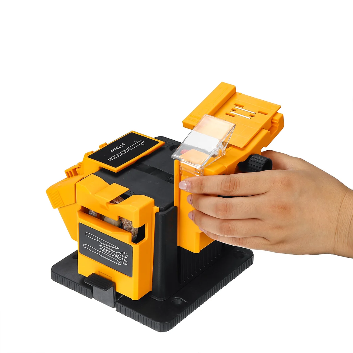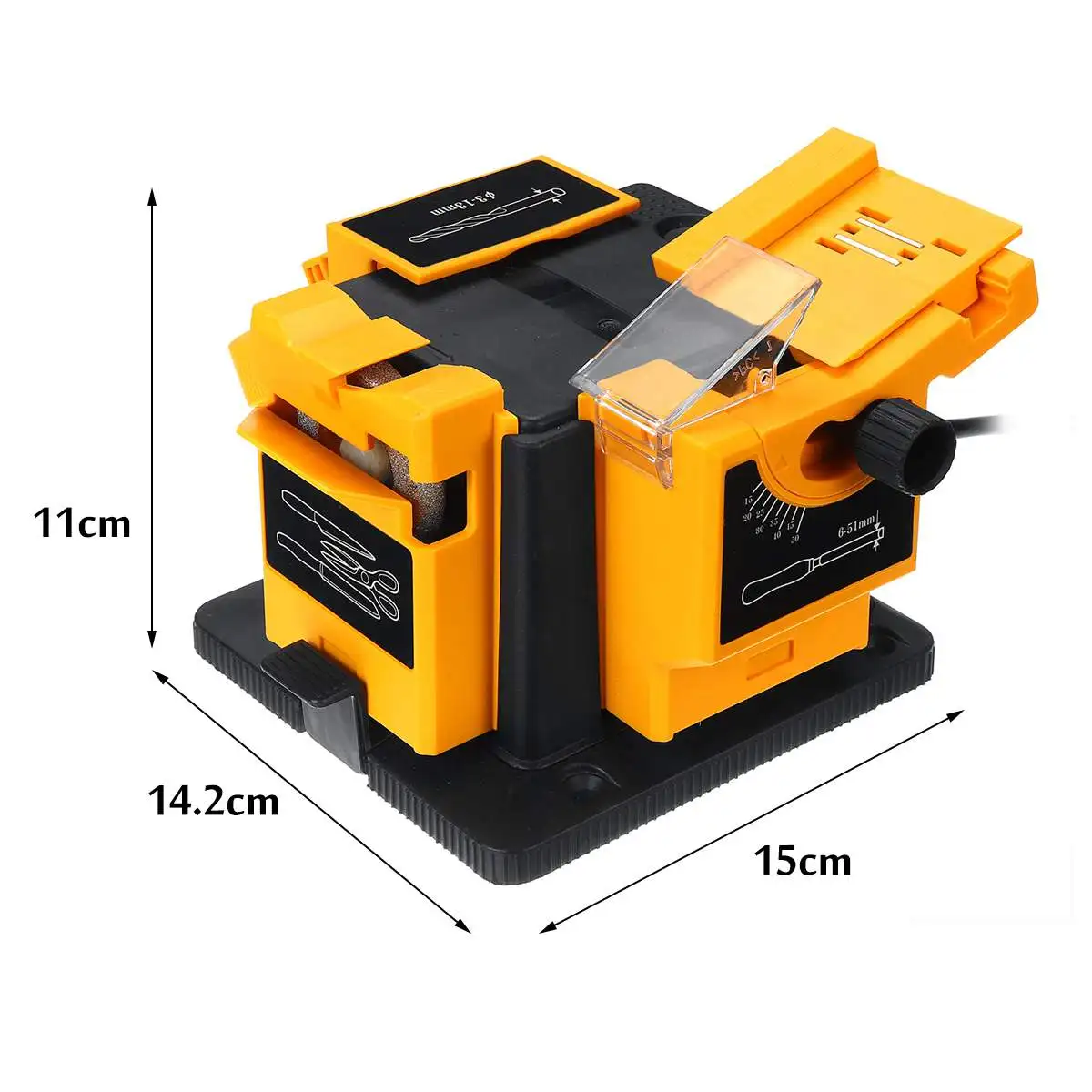 Особенность: -Подходит для начинающих домашних хозяйств для ремонта всех видов инструментов, регулируемого угла, ширины. Особенно подходит для начинающих ремонтных строгальных станков, долот, ножниц, сверл и т. д. -Широкий спектр применения и простота использования -Высокопрочный инженерный пластиковый корпус, прочный -Легко носить с собой -Этот многозадачный заточный инструмент включает в себя три рабочих модуля -Затачивайте все быстрорежущие стальные сверла от 3 мм до 13 мм. -Шлифовальное долото и плоскость bla des шириной от 6 мм до 51 мм.