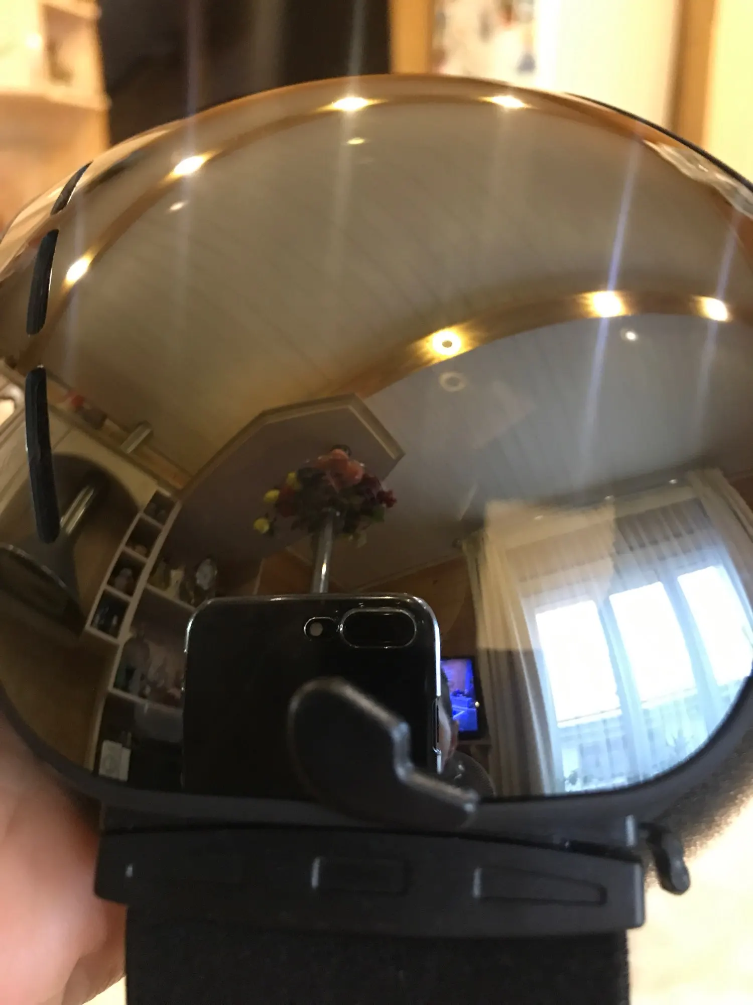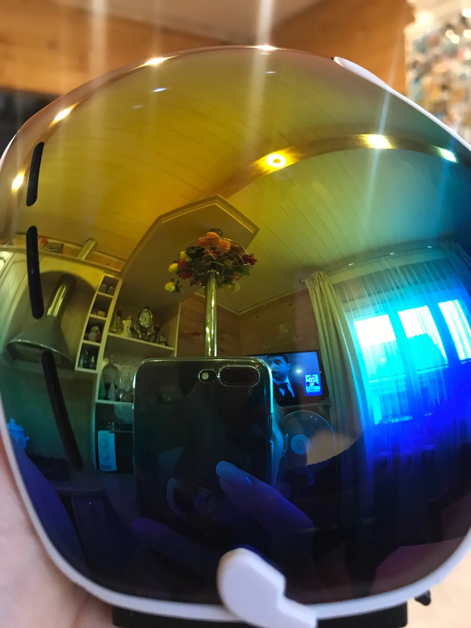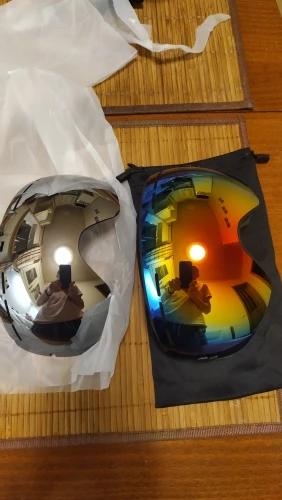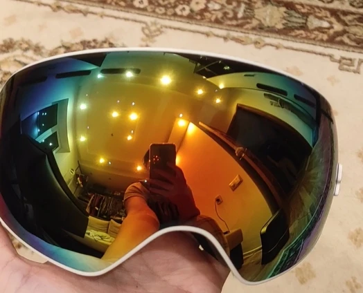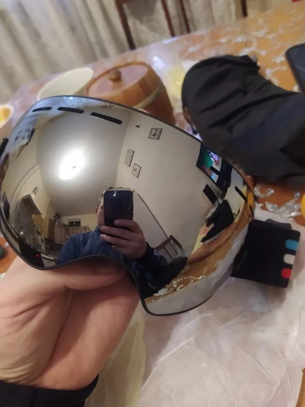 Посылку доставили быстро, упаковка отличная, несколько транспортировочных пакетов и пленка на внутреннем стекле. Есть чехол, но он немного маловат, не класть в него а натягивать). Уплотнитель паралон, похоже пропитан чем-то. Ремень просиликонен, широкий регулировать легко в перчатках. Внутренняя линза не потеет. Внешнее зеркало сидит довольно плотно, по периметру защелки 9 штук и 2 по бокам поворотных зажима. Сменить зеркало быстро не получиться, да и не стоит этого делать часто на данной модели, конструкция долго не проживет. Если нужно менять стекло, лучше брать на магнитах. Цветофильтр на стекле разноцветный, сверху фиолет, к центру синий, вниз зеленый, поляризации нет. Расстояние от стекла до глаз большое, поэтому маска смотрится немного громоздко, но зато лучше вентилируется и под нее можно одеть очки.