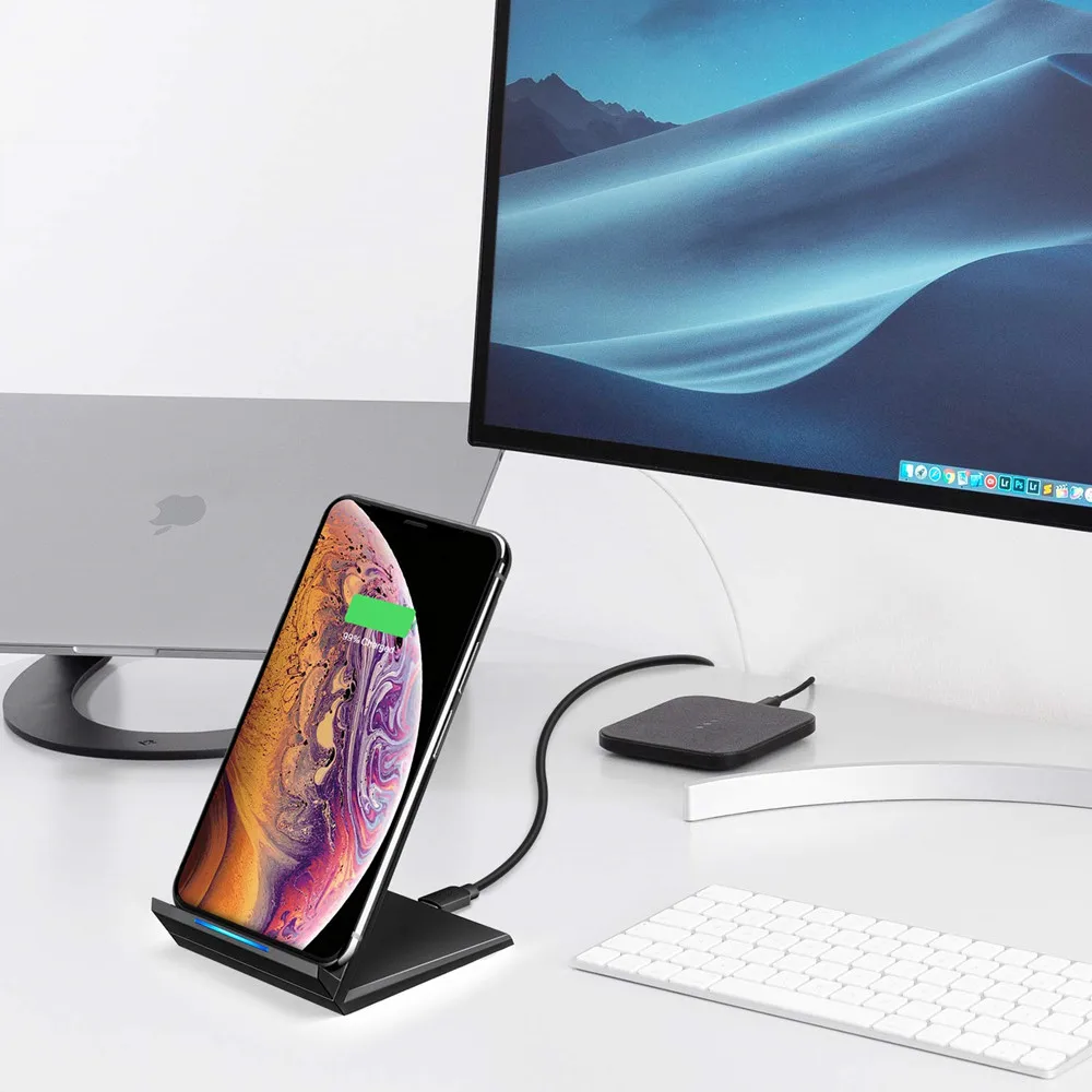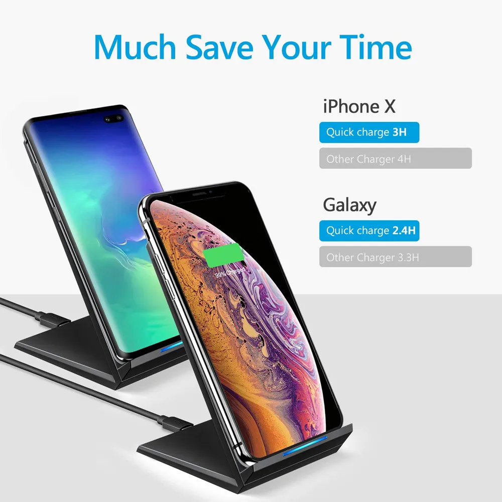 Различные режимы беспроводной зарядки --15 Вт быстрый режим беспроводного зарядного устройства для Galaxy S10/S9/S9 +/S8/S8 +/Note9/8; 7,5 Вт беспроводной режим зарядки для литий-ионных аккумуляторов iPhone Xs Max/Xs/XR/iPhone X/8/8Plus, 5 Вт стандартный режим зарядки для литий-ионных аккумуляторов других телефонов, которые поддерживают беспроводную зарядку.