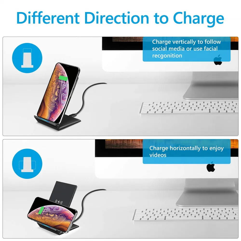Разное направление зарядки --Он может заряжать ваш телефон как вертикально, так и горизонтально. Установите горизонтально, чтобы наслаждаться видео во время зарядки, или перейдите по вертикали для видеоконференций или использовать технологию распознавания лиц.