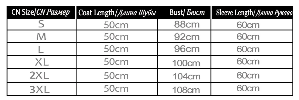 Обратите внимание, что:1.Это зимнее пальто, поэтому, как правило, мы советуем покупателю выбрать размер немного больше на 4-6 см, чем размер бюста, так что вы можете носить одежду внутри2.Если вы не уверены, какой размер выбрать, пожалуйста, свяжитесь с нами, мы поможем вам выбрать.3.Из-за проблемы съемки светильник и за разных цветовых настроек мониторов фактический цвет товара может незначительно отличаться некоторые пальто будет иметь отличие в цвете, если вы имеете что-то против, вы можете связаться с сотрудниками Отдела по обслуживанию клиентов, чтобы понять эту проблему.