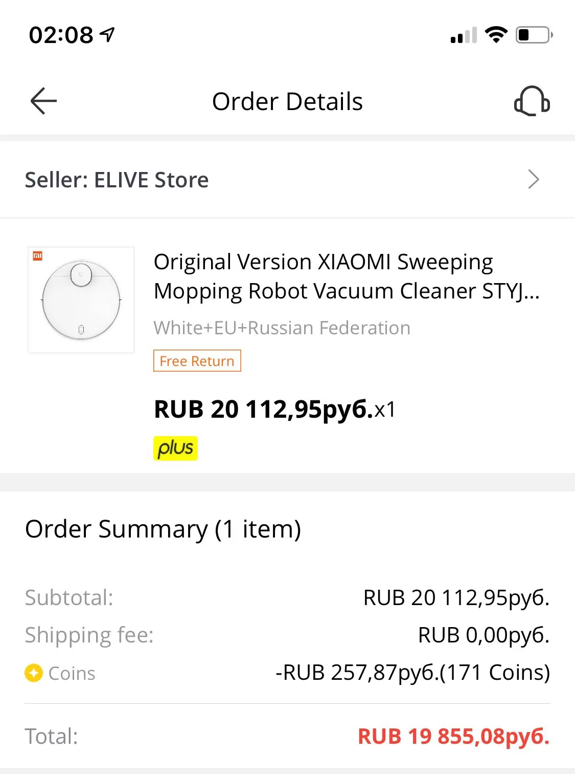 Новый помощник пришёл очень быстро, заказали 14.02, курьер привёз 22.02. Зверёк очень шустрый, понятливый, хотя озвучка пока только китайская, инструкция тоже китайская, но в интернете есть всё. Единственное, что немного расстроило - интернет тол ко в телефоне, роутера пока нет, для малыша сигнал слабоват, поэтому через пр ложение пока не запустить, тестировали вручную, благо есть такая возможность. Оббежал всю квартиру, все подмел, изучил все помехи и неровности, потом пробежал дежурный раз, потом помыл и укатил на заслуженный отдых на станцию. В общем пылесосом очень довольна, прямо настоящий помощник, собрал все, что мог и даже больше и помыл в меру своих сил (за домом стараюсь следить, так что полы и так чистые, просто дополнительная влажная уборка, не занимающаяся моё личное время). Товар рекомендую однозначно. С продавцом общаться не пришлось.