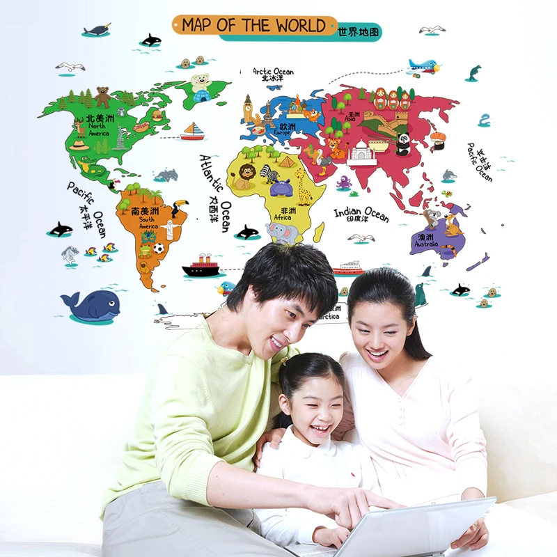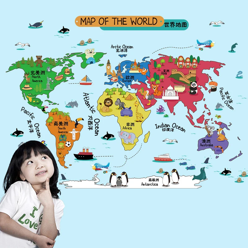 60*92 см классические Мультяшные животные карта мира настенные стикеры Съемные ПВХ самоклеящиеся виниловые наклейки детская комната Обучающие плакаты