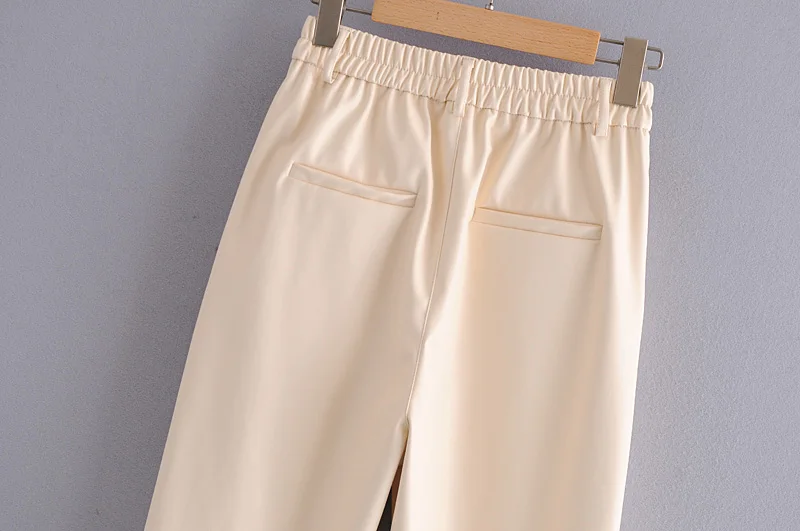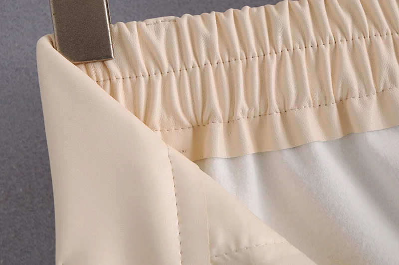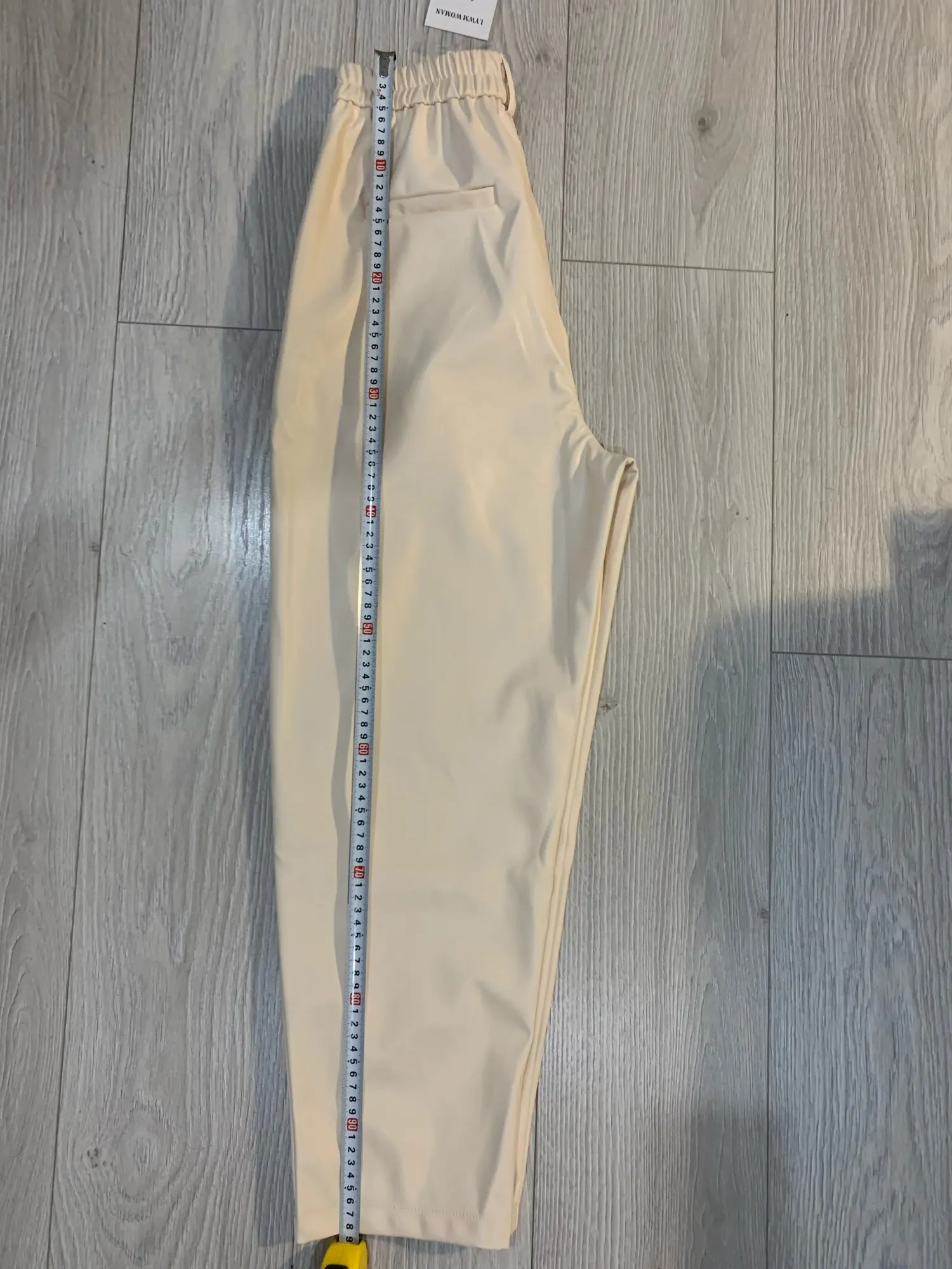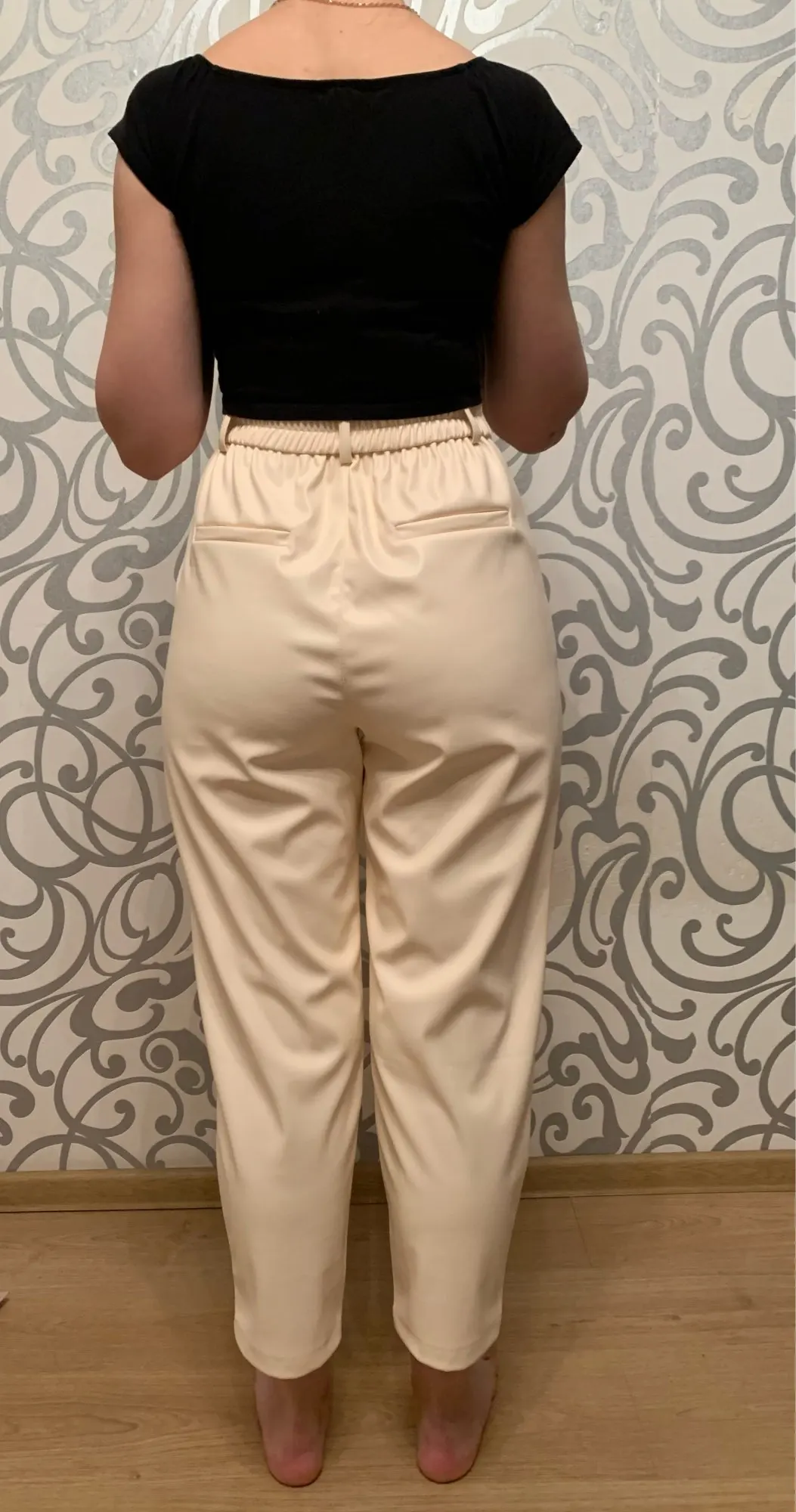 на параметры рост 167, от66, об 91 заказали размер s. в бедрах свободно, талия хорошо, длина по щиколотку. модель бананами, она м не должна обтягивать. пояс на резинке. возможно xs был бы лучше. цвет теплый сливочный. ткань кожзам, запаха постороннего нет. с изнанки не голый кожзам, имеется начес, типа фланели или тонкого флиса ( не знаю как называется). карманы сзади обманка. глубина карманов сбоку средняя. упаковка в ЗИП пакет, доставка почтой.
