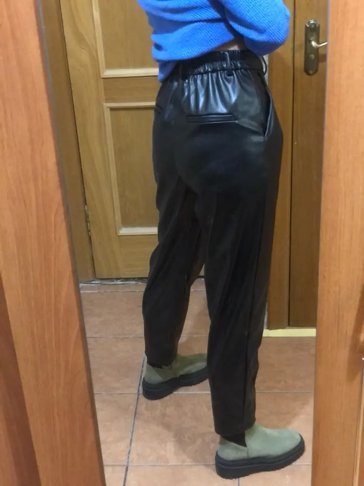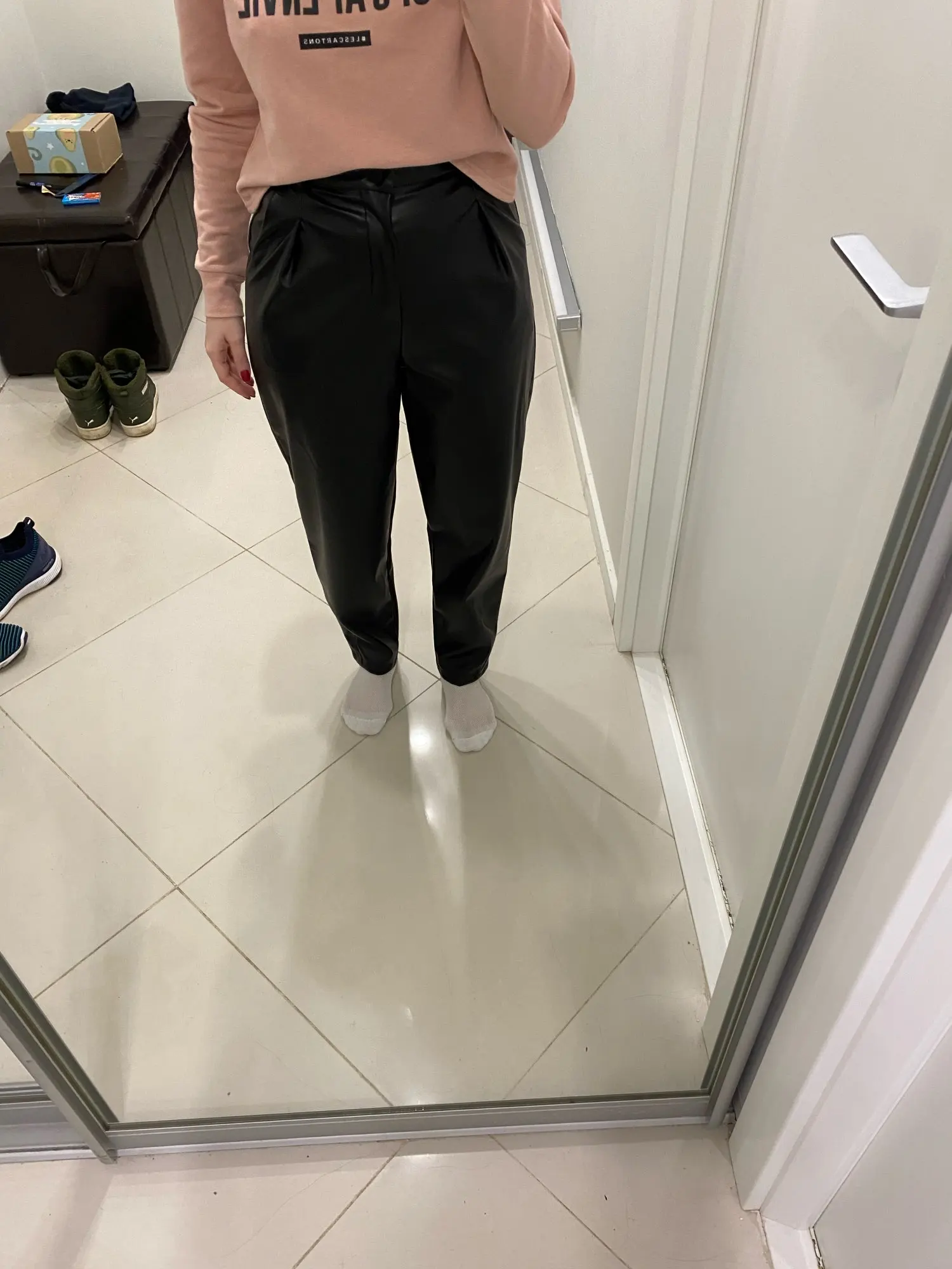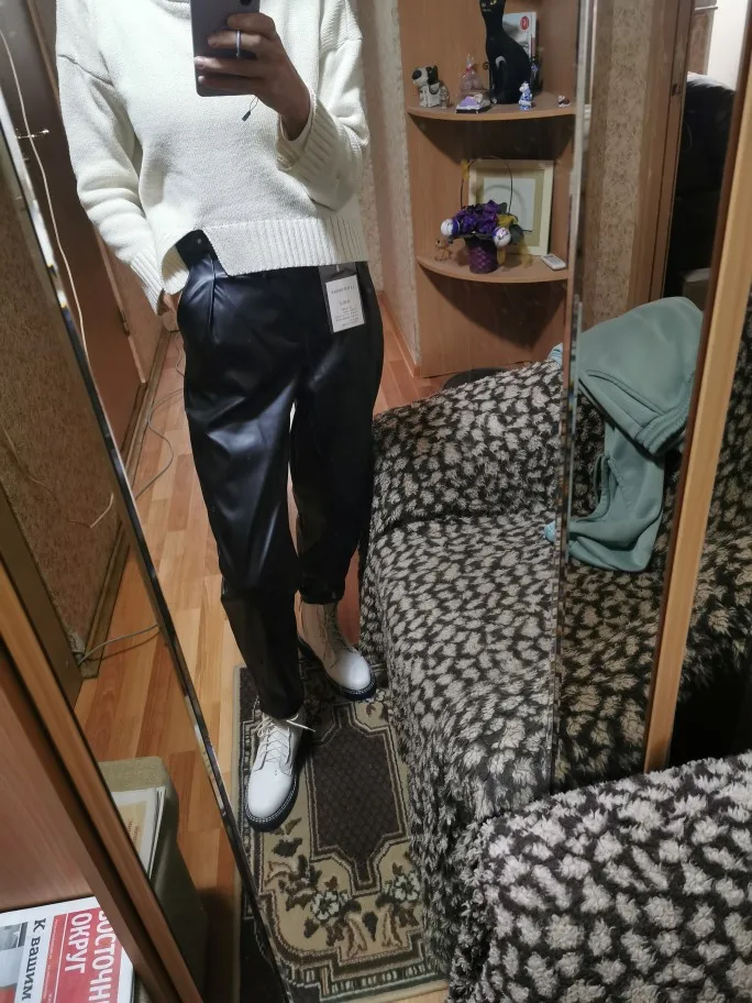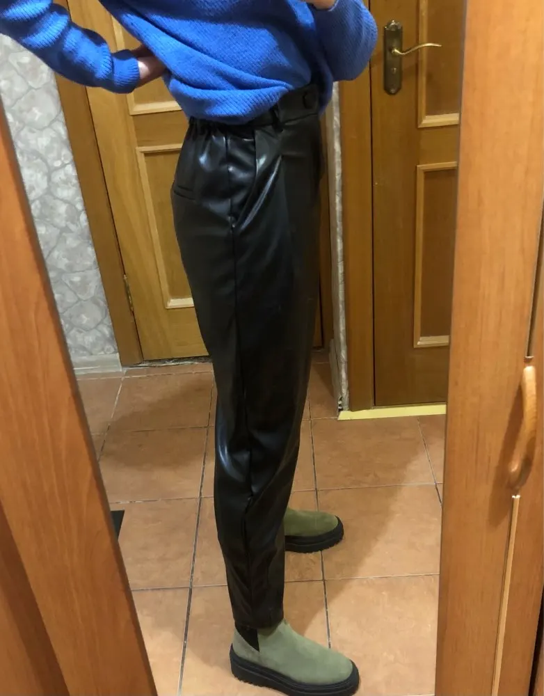 Брюки понравились. С размером угадала. На параметры 66-90 см и рост 172 S-ка села великолепно, хороший крой, нигде не давит и не висит,длина 7/8,с ботинками отлично. Кожзам довольно плотный, но мягкий, нет дешевого блеска. Доставка быстрая - 12 дней до Москвы.