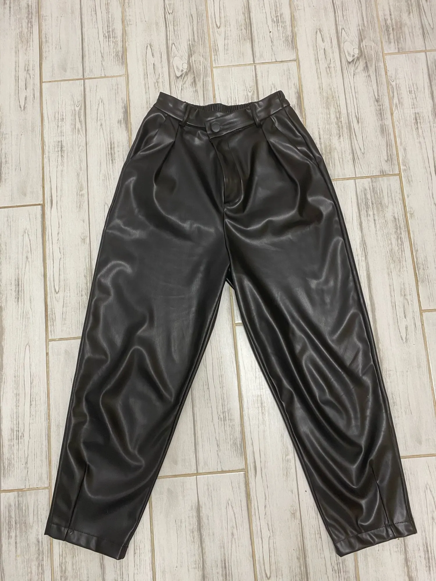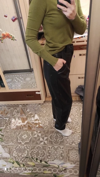 брючки отличные, это мои вторые брюки, первый раз брала в черном цвете, очень довольна, ношу с удовольствием, очень комфортные, с полусопожками смотрятся офигенно, блеска почти нет, очень похожи на натуральную кожу, но тоньше, за этот счёт и не полнят, на мои параметры 79-103, рост 178, 48 размер брюки отлично подошли, чуть коротковаты, но ничего, вообщем очень довольна, посылка пришла за месяц, продавец отзывчивый