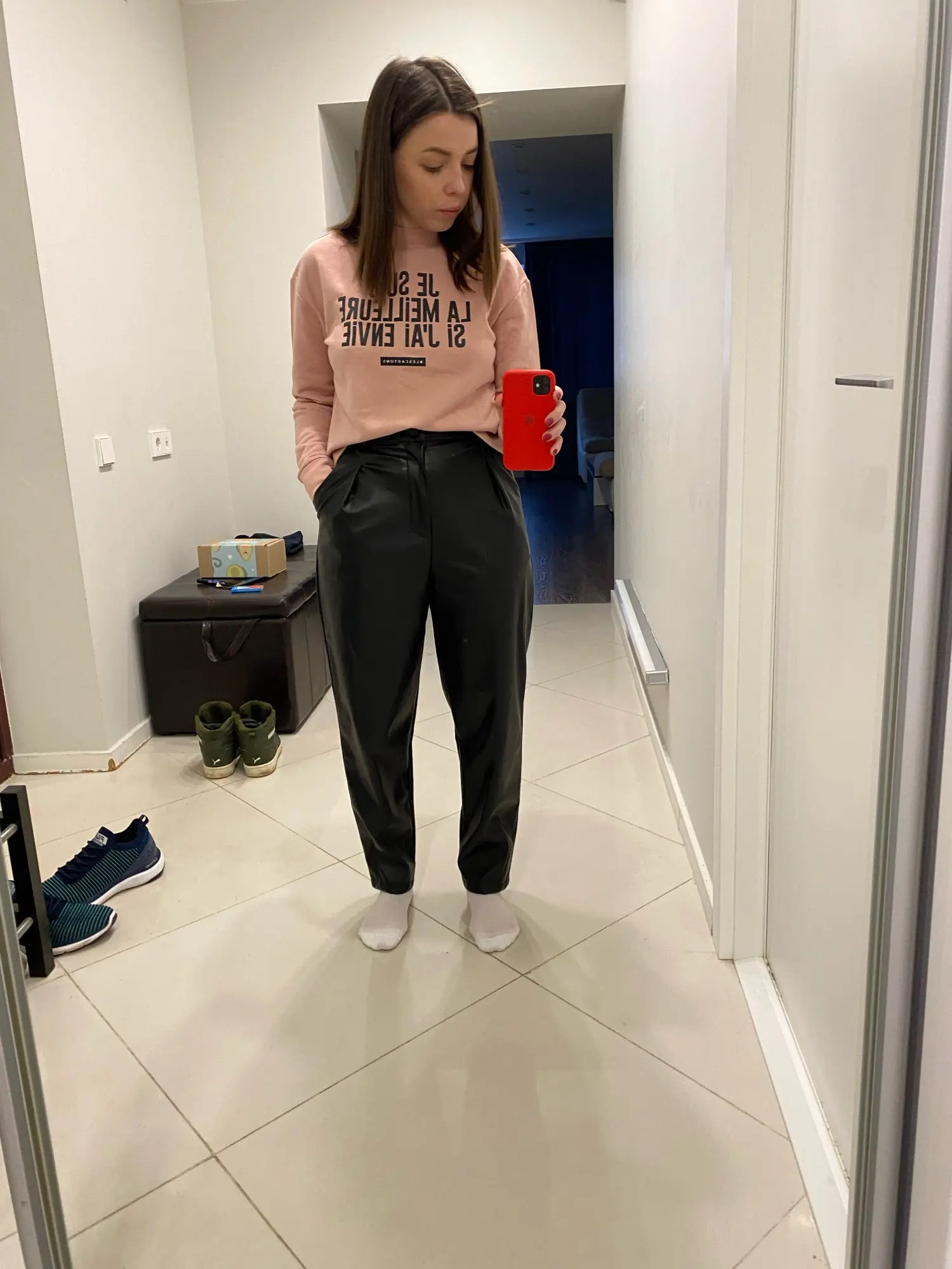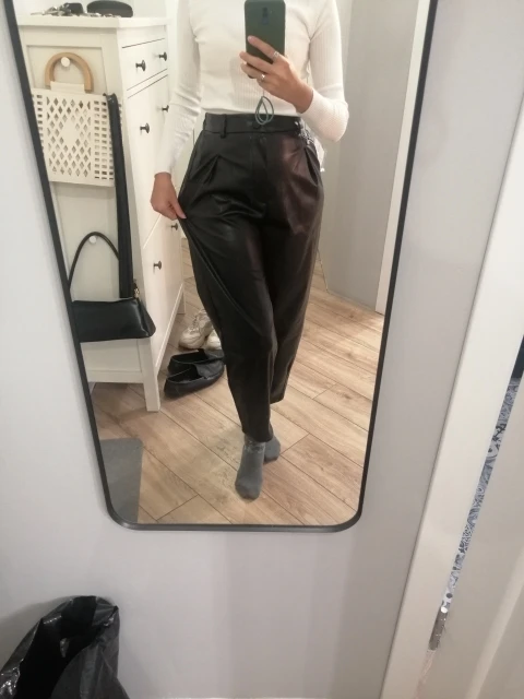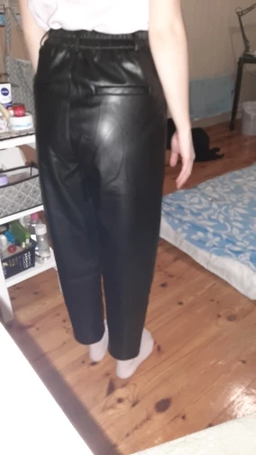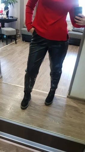 Брюки понравились, сшиты аккуратно. Материал блестит, конечно, не выглядит как натуральная кожа. На параметры 63/92 размер С сел хорошо, в талии очень плотно, в бёдрах свободно. На рост 163 ростовка отличная. В них жарко, на холодную погоду ок.