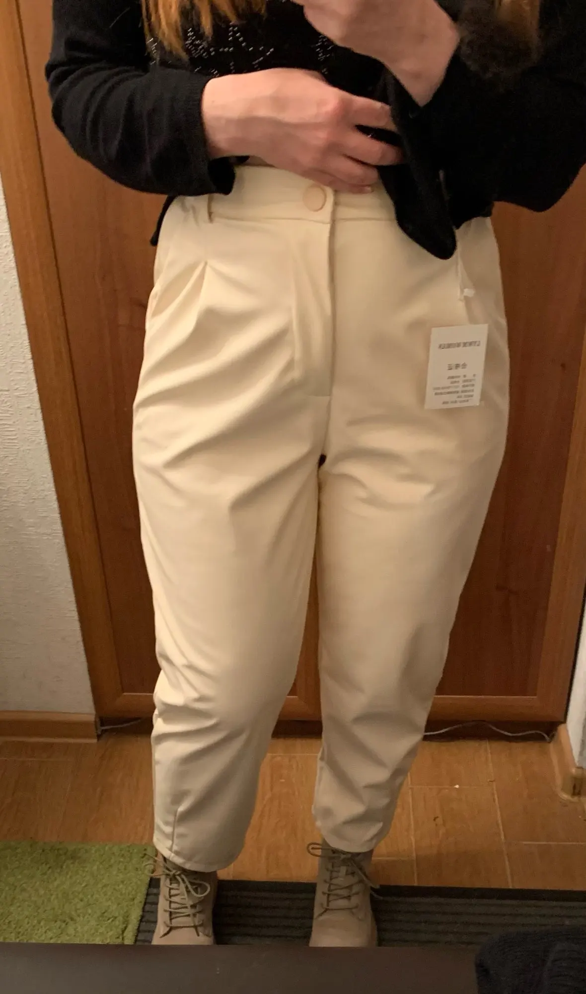 Цвет красивый бежевый, брюки сели отлично (благодаря резинке). Материал приятный на ощупь, внутри типа флиса, тоже классно. Пришли быстро. Ходить в них буду однозначно! От 70 Об 90, взяла М, на талии плотненько, по ногам свободно. На рост 163, по щиколотку.