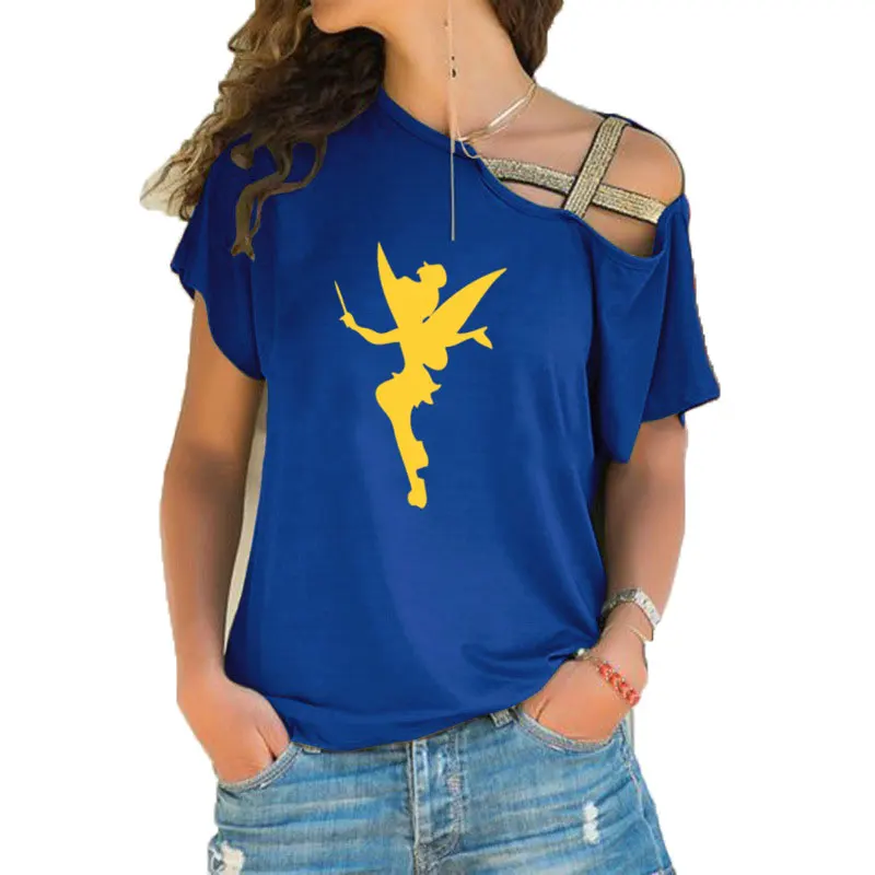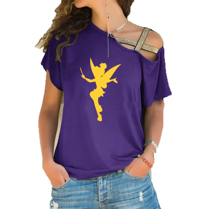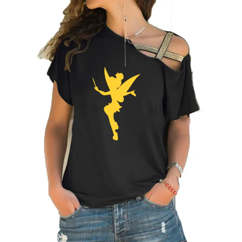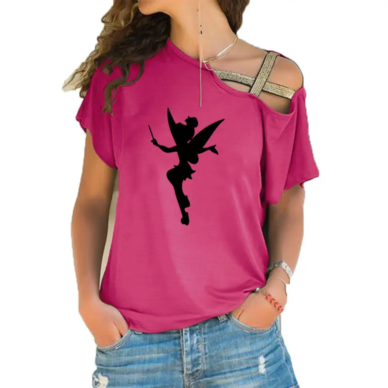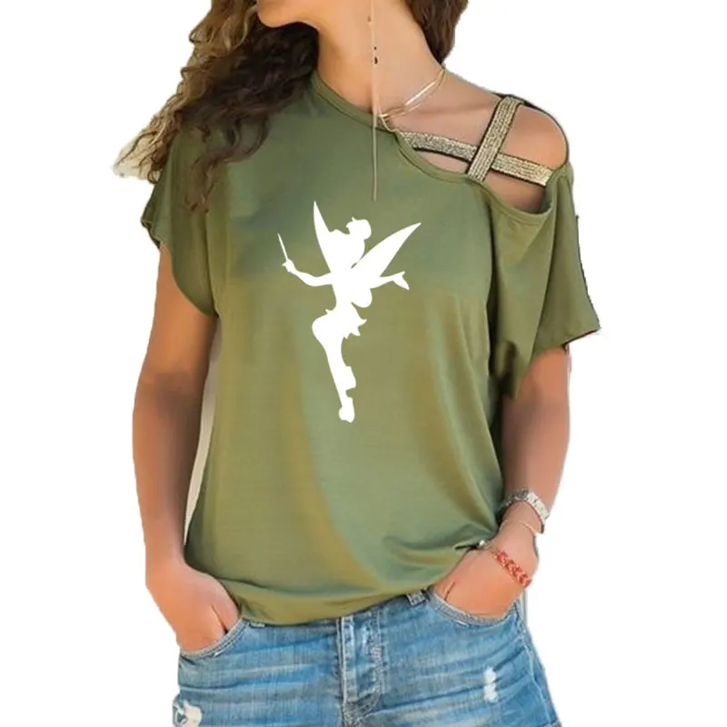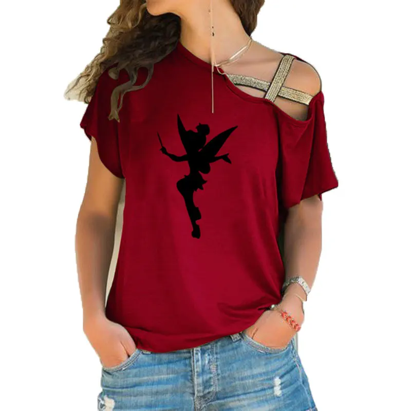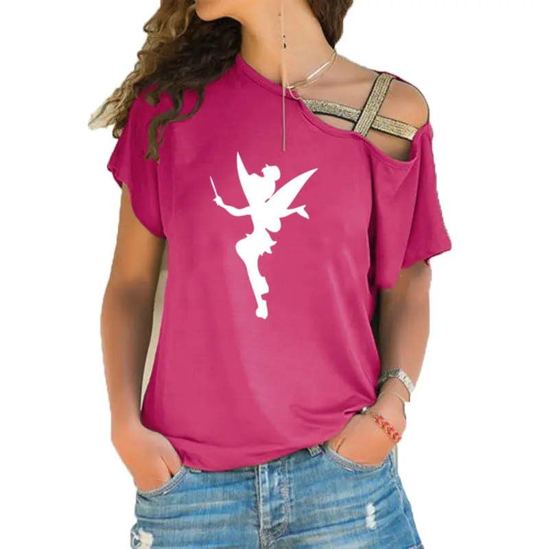 Новинка, женская футболка фея с мультяшным принтом, Женская милая Асимметричная бандажная футболка с перекрестным ремнем