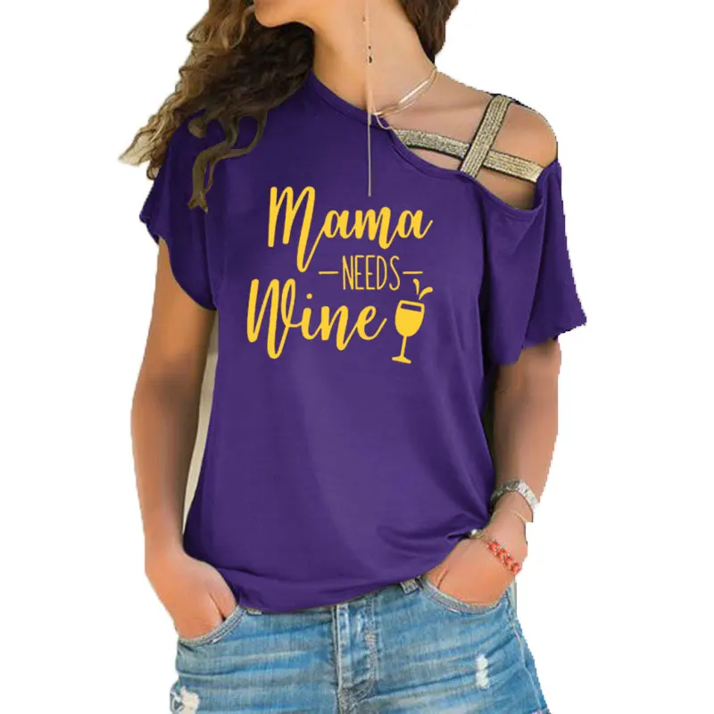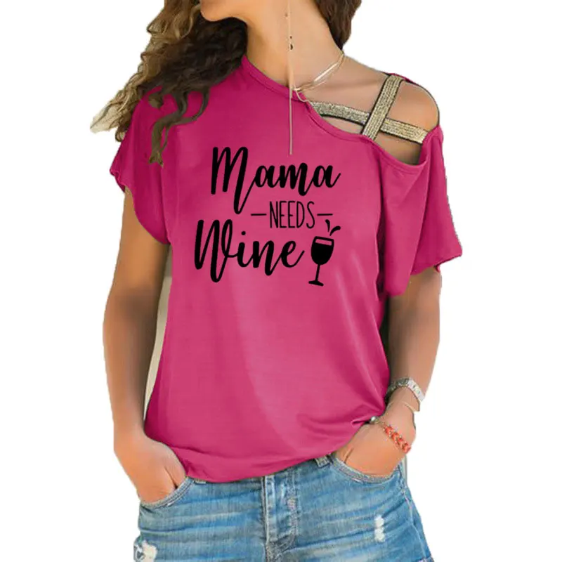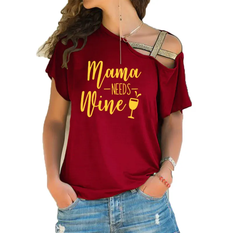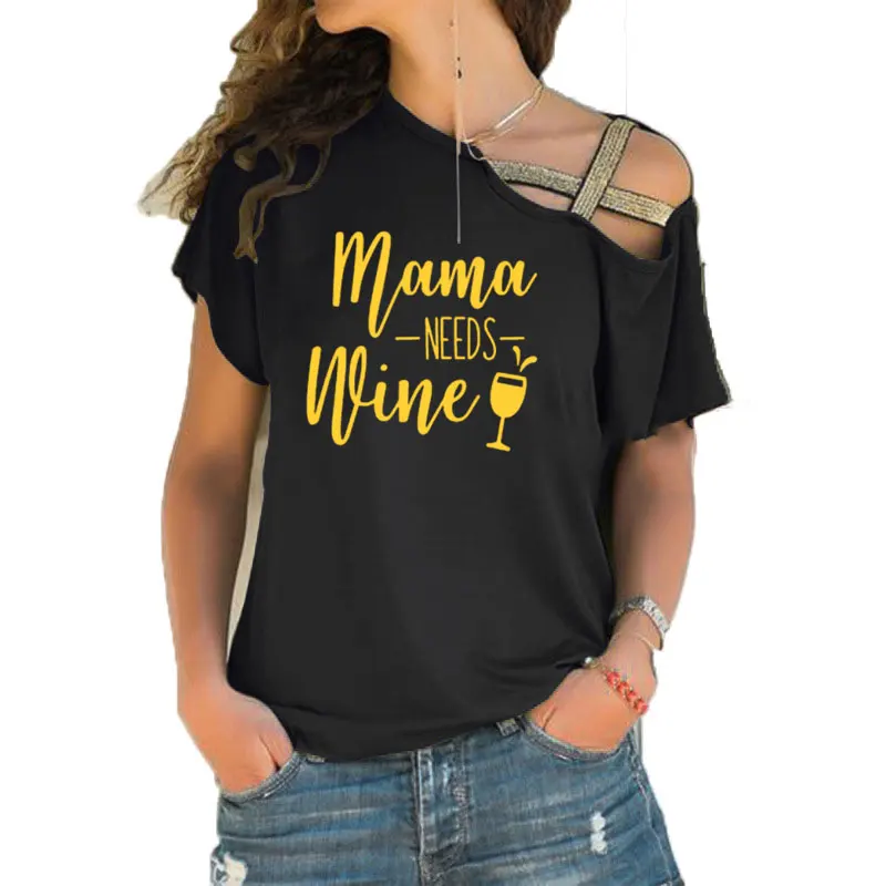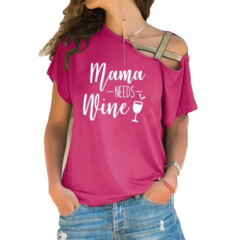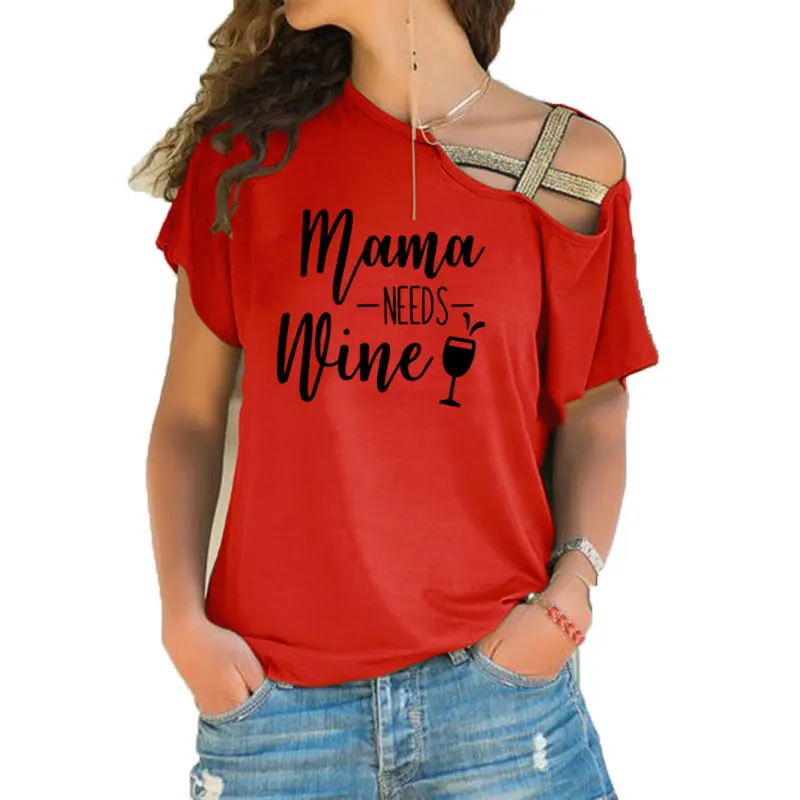 I Love Mama потребности вино Футболка модная женская рубашка подарок для мамы футболки лозунг забавные в готическом стиле с коротким рукавом Нерегулярные Косой, накрест, облегающий, футболки, топы