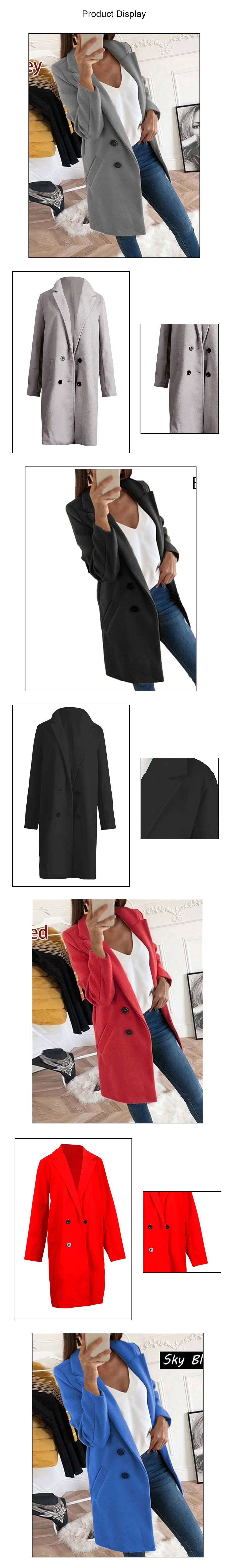 Женское двубортное пальто, зимнее модное Однотонное шерстяное пальто с отложным воротником, повседневное офисное длинное пальто с карманами и длинным рукавом