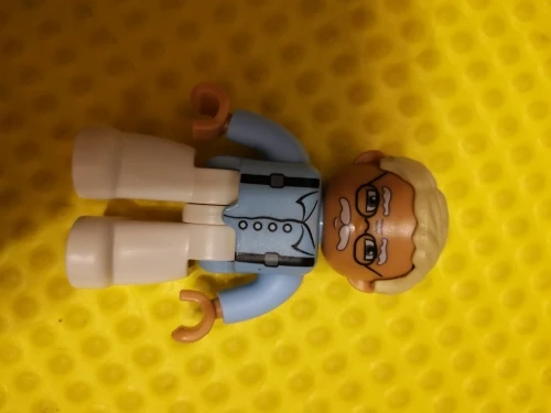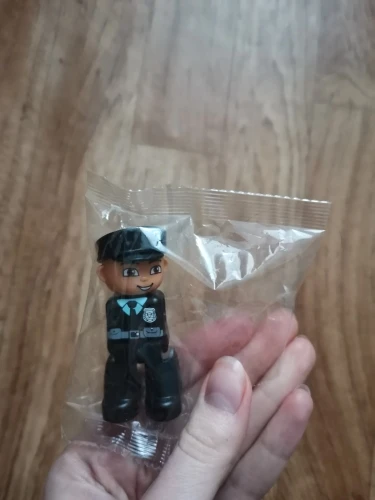 Может сидеть и стоять на блоках duplo. Хорошая кукла. Ножки на 2 мм шире, чем у duplo. Быстрая доставка.