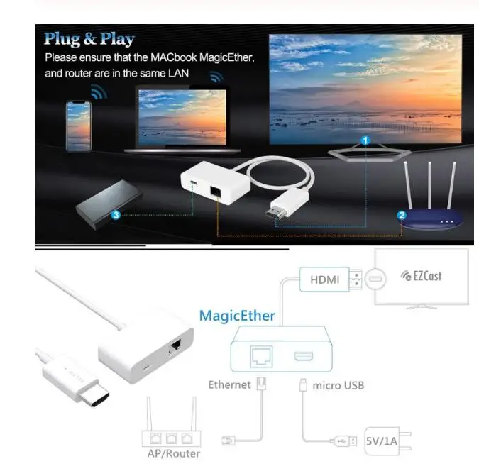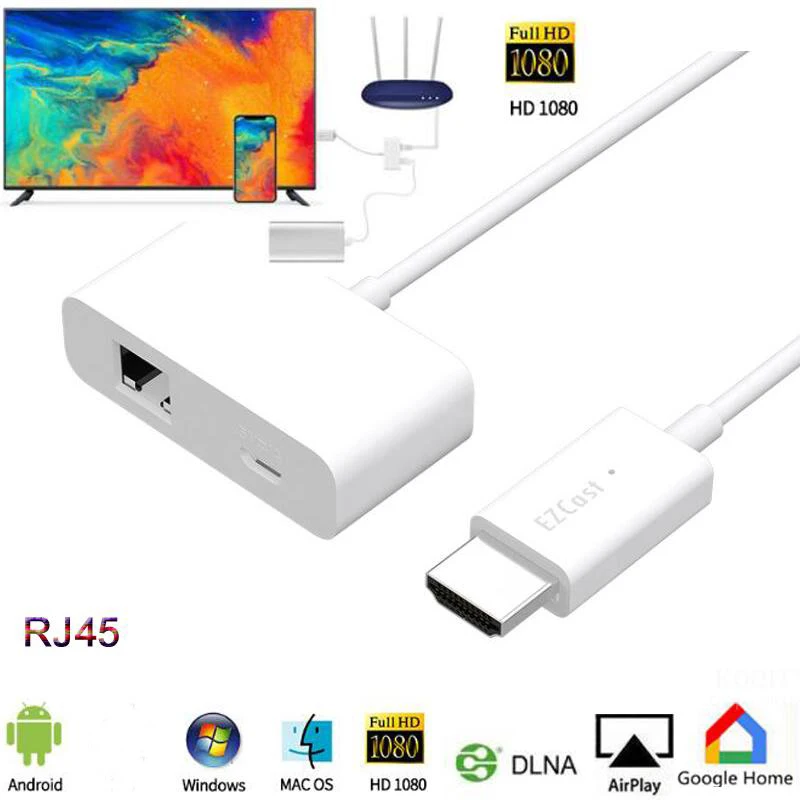 EZCast RJ45 сетевой провод MagicEther, Беспроводные Wi-Fi дисплеи Dongles Airplay, DLNA экран, зеркальное отображение HDMI, Совместимость с Android ПК