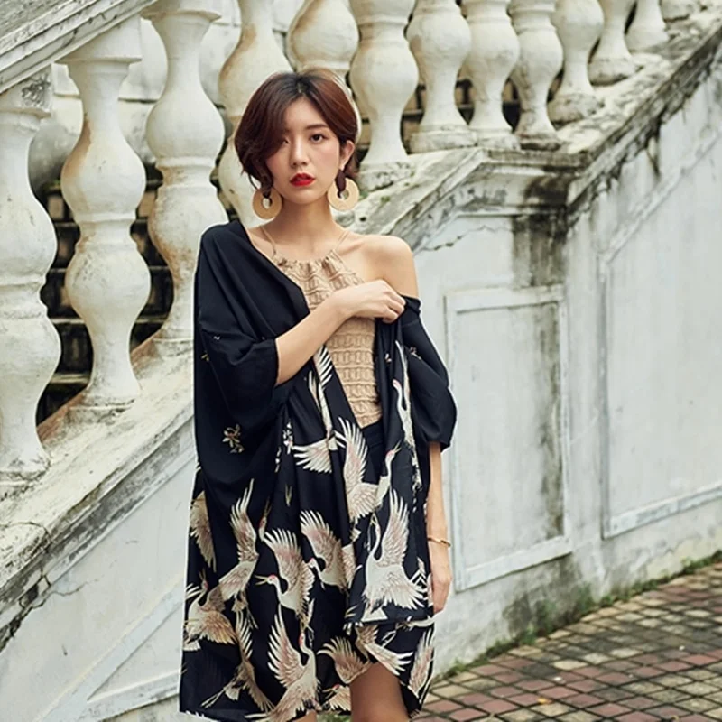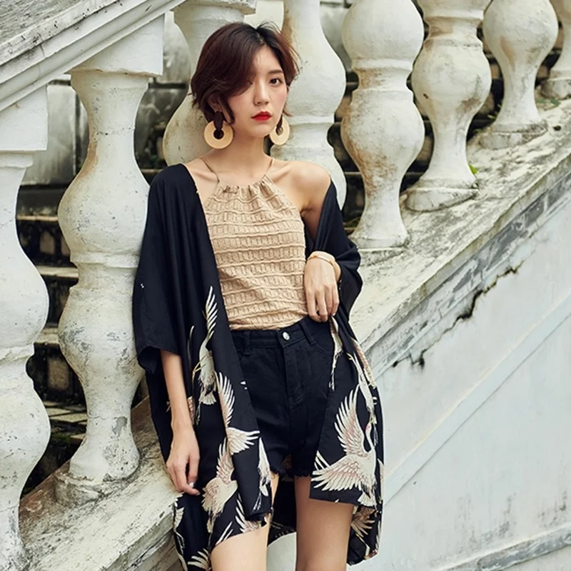 Кимоно FF2302 женское с японским принтом Журавля, юката, кардиган для защиты от солнца, рубашка в стиле унисекс, хаори, Топ