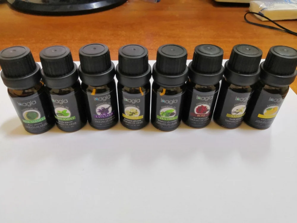 Все пузырьки сделаны из тёмного стекла. Масло лаванды очень помогло при борьбе с бессонницей. Перечная мята и чайное дерево хорошо "пробивают" нос при насморке. Ваниль и жасмин идеально подходят в качестве аромата для дома или для ароматических кулонов. Доставка до Киева заняла 3 недели.
