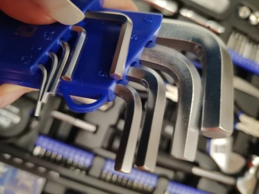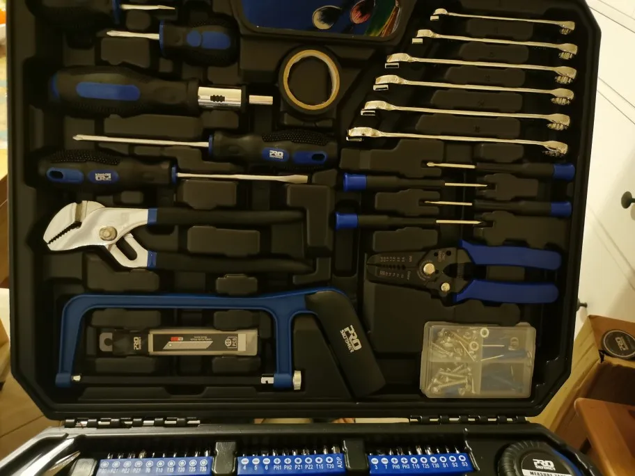 набор реально хороший. внешне качество кажется ниже из-за излишнего блеска, но на деле все гораздо лучше. наконец-то все основные инструменты будут в 1 месте и будут занимать минимум пространства. отдельно можно выделить качество кейса и замков на нем - просто классный. рекомендую.