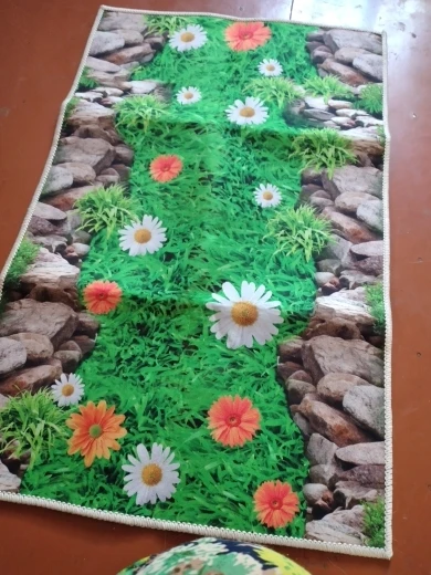 Доставка 20 дней. Коврик сделан качественно. Краски яркие, как на фото. Снизу похоже на прорезининую основу, а сверху, где рисунок как матерчатый. При этом коврик легко складывается и, наверное, можно стирать в машинке.