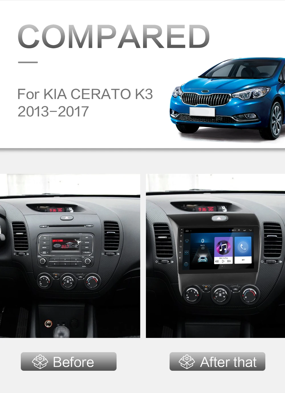 Для Kia K3 Cerato Forte 2013 2014 2015 2016 20171, 4-ядерная конфигурация включает (RAM + ROM): 1G + 16G / 2G + 16G / 2G + 32G / 4G-SIM-3560-2G + 32G [опционально];2, 8-ядерная конфигурация включает (RAM + ROM): 7260L-2G + 32G / 7260L-4G + 64G / 4G-SIM-5760-2G + 32G / 4G-SIM-5760-4G + 64G / 4G-SIM-TS10-4G + 32G / 4G-SIM-TS10-6G + 128G [опционально];3, 4-ядерный содержит: версию: Android 8,1;Четырехъядерный процессор MTK8227 / Cortex-A7Поддержка логотипа автомобиля 5; Заводской пароль: 8888Разрешение: HD 2.5D,1024*600;Не поддерживает функцию AM, RDS;Обыпосылка пакет версии Wi-Fi поддерживает функцию вывода видео;Версия 3560-4G-SIM-WiFi: Android 8,1; Поддерживает DSP; Не поддерживает функцию вывода видео;4, 8-ядерный содержит версию: Android 9,0 или Android 10;Восемь ядер: CPU Quad core и GPU Quad core соответственно;Поддержка логотипа автомобиля 5; Пароль завода: 8888; Разрешение: HD 2.5D,1024*600;Версия 7260L-WIFI: поддерживает функции DSP, разделения экрана; Не поддерживает выход видео;Версия 4G-SIM-5760-WIFI и 4G-SIM-TS10-WIFI: поддерживает функции DSP , IPS , Carplay, разделения экрана; Не поддерживает видеовыход;5. Операционная система Android может установить приложение Google Play store Skype Facebook youTube Twitter и т. д.;6. Поддержка: радиостанции, звонков по Bluetooth, музыки по Bluetooth, управления рулевым колесом, встроенного Wi-Fi, MP3, видео-музыки (MPG, AVI), навигации, видеовыхода, зеркальной связи, USB 4G LTE Wi-Fi ключ и другие функции;