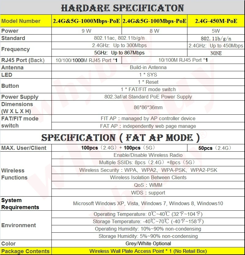 (1). Это точка доступа к настенной пластине последнего поколения, которая может быть установлена в любом стеновом гнезде 86mmX86mm, не нарушая существующие украшения. Он поддерживает 5th generation стандарт Wi-Fi 802.11ac и concurent двухдиапазонный Wi-скорость до Wi-Fi 5 ГГц 867 Мбит/с и 2,4 ГГц 300 Мбит/с/450 Мбит/с. Он хорошо подходит для обеспечения покрытия wifi для виллы, университетских общежитий, больничных отделений, гостиничных номеров и других мест с плотно разделенными комнатами.
