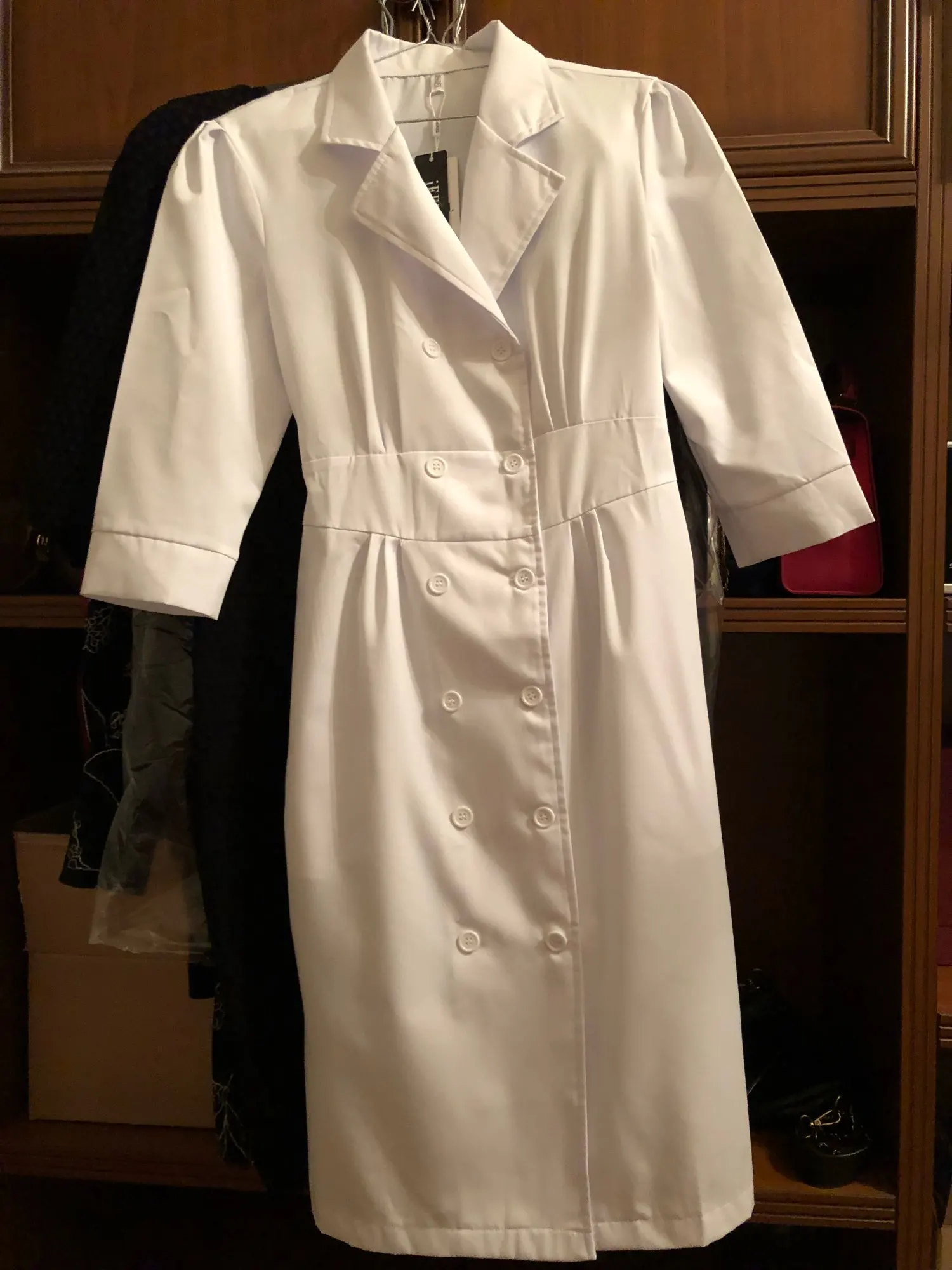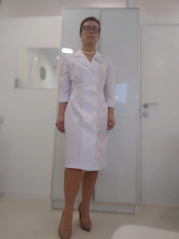 Бомбический халат. Отлично сидит на фигуре, даже подгонять не надо. Сзади можно перешить пуговку, чтобы посадить точно по фигуре и это все! -Мерила моя дочь стоматолог (26 лет) ей хорошо и мерила я - тоже хорошо. -Хорошо сидит и не тянет, при сведении рук впереди. -Длина хорошая, закрывает колено (рост 168) Смотрите обзор на Yuotube delvina.kosmetolog