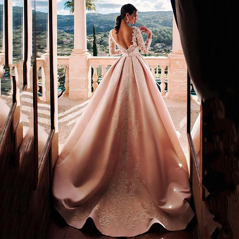 Платье свадебное с длинным шлейфом, атласное, с длинным рукавом