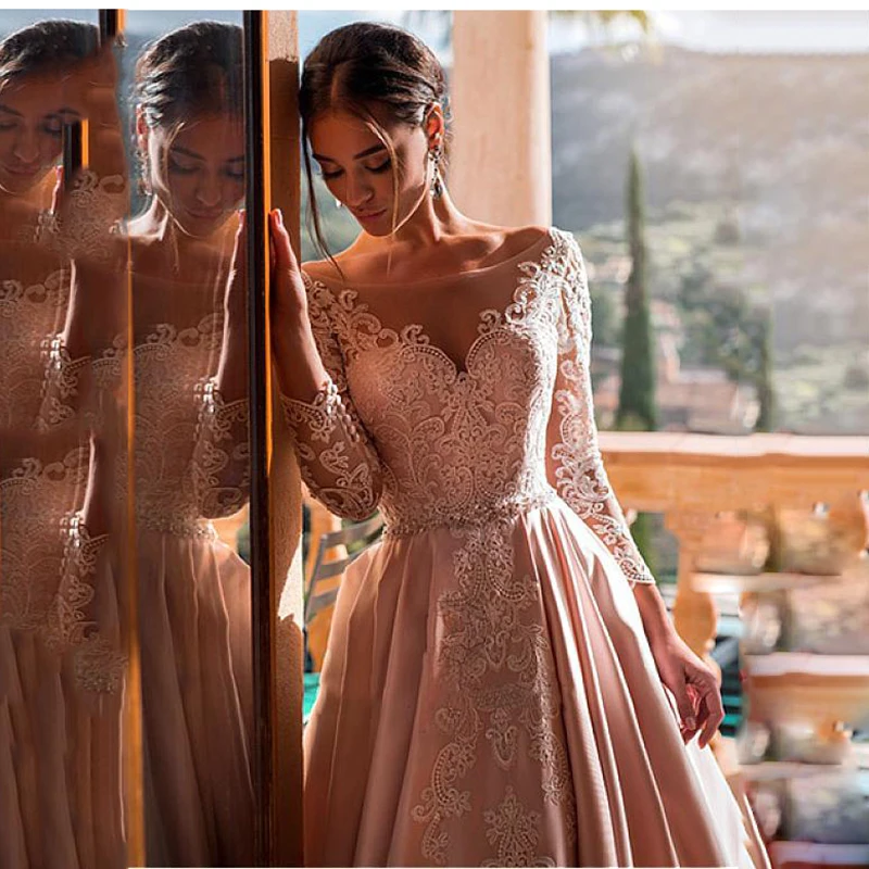 Розовое атласное свадебное платье с кружевной аппликацией и V-образным вырезом, ТРАПЕЦИЕВИДНОЕ свадебное платье принцессы с длинным рукавом, элегантные свадебные платья