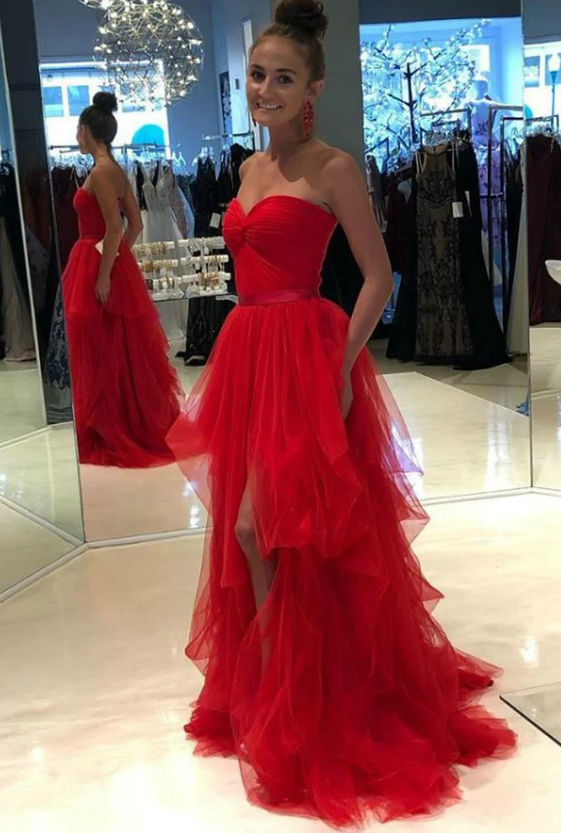 Вечернее платье без бретелек, с высоким разрезом, с блестками