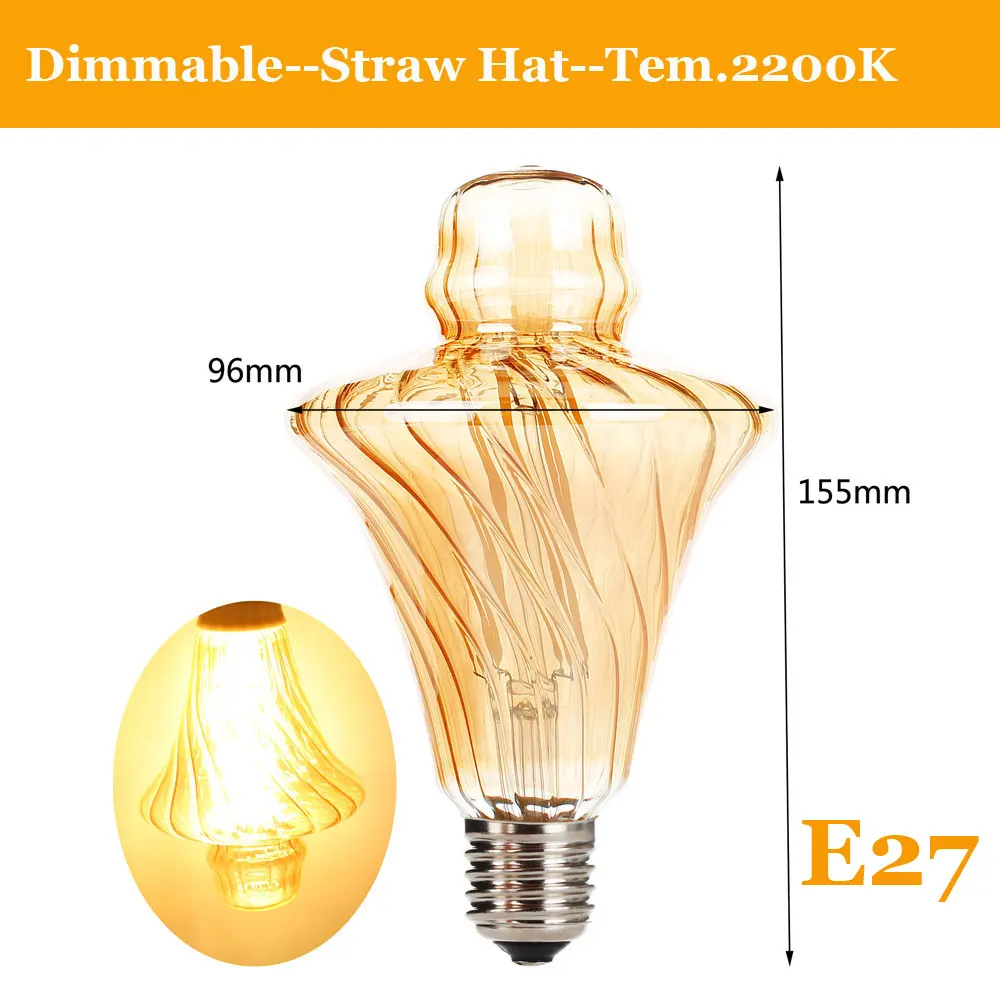 • Материал: стекло и металл • Тип лампы: лампа накаливания • Основание лампы: E27( G125, G95, G80, ST64, T30, A60, соломенная шляпа) • Стиль лампы: G125, G95, G80, ST64, T30, A60, соломенная шляпа, стиль C35 M, саржа C35. • Форма лампы: Креативный светодиодный светильник Эдисона • Напряжение: Ретро светодиодный светильник 220V • Диммируемая или нет: диммируемая: G125, G95, G80, ST64, T30, A60, соломенная шляпа