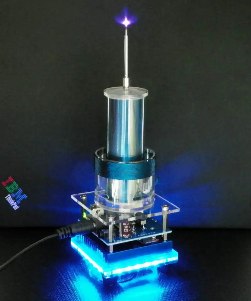 Небольшая Катушка Тесла при работе генерирует высокочастотное и высоковольтное электрическое поле и создает дугу через разрядный электрод.
