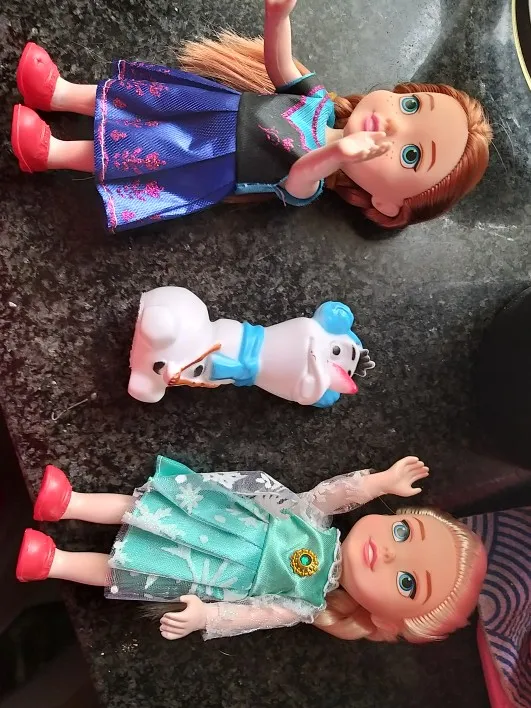 Я заказал «с коробкой», но вместо того, чтобы принимать новых кукол в коробке, я получил уже открытые куклы и сломанную, складываемую коробку в посылке. Был возвращен за разницу в цене, так что это было хорошо. Но качество кукол нормальное. На голове почти нет волос, и швы платьев уже развалились. Но цена все в порядке, я думаю. Для сравнения размеров сфотографированы вместе с обычными куклами Анны, Эльзы и Барби Челси.