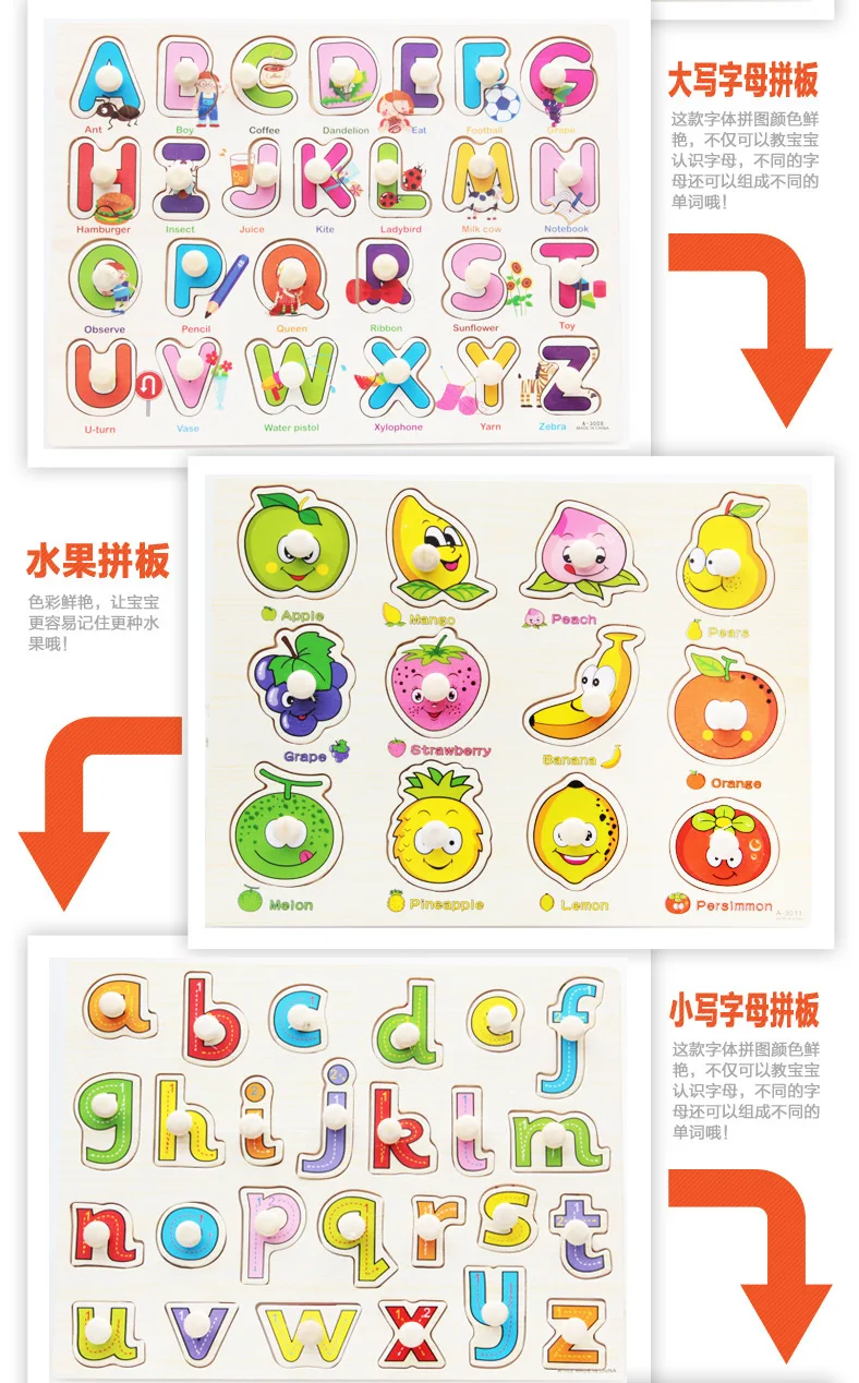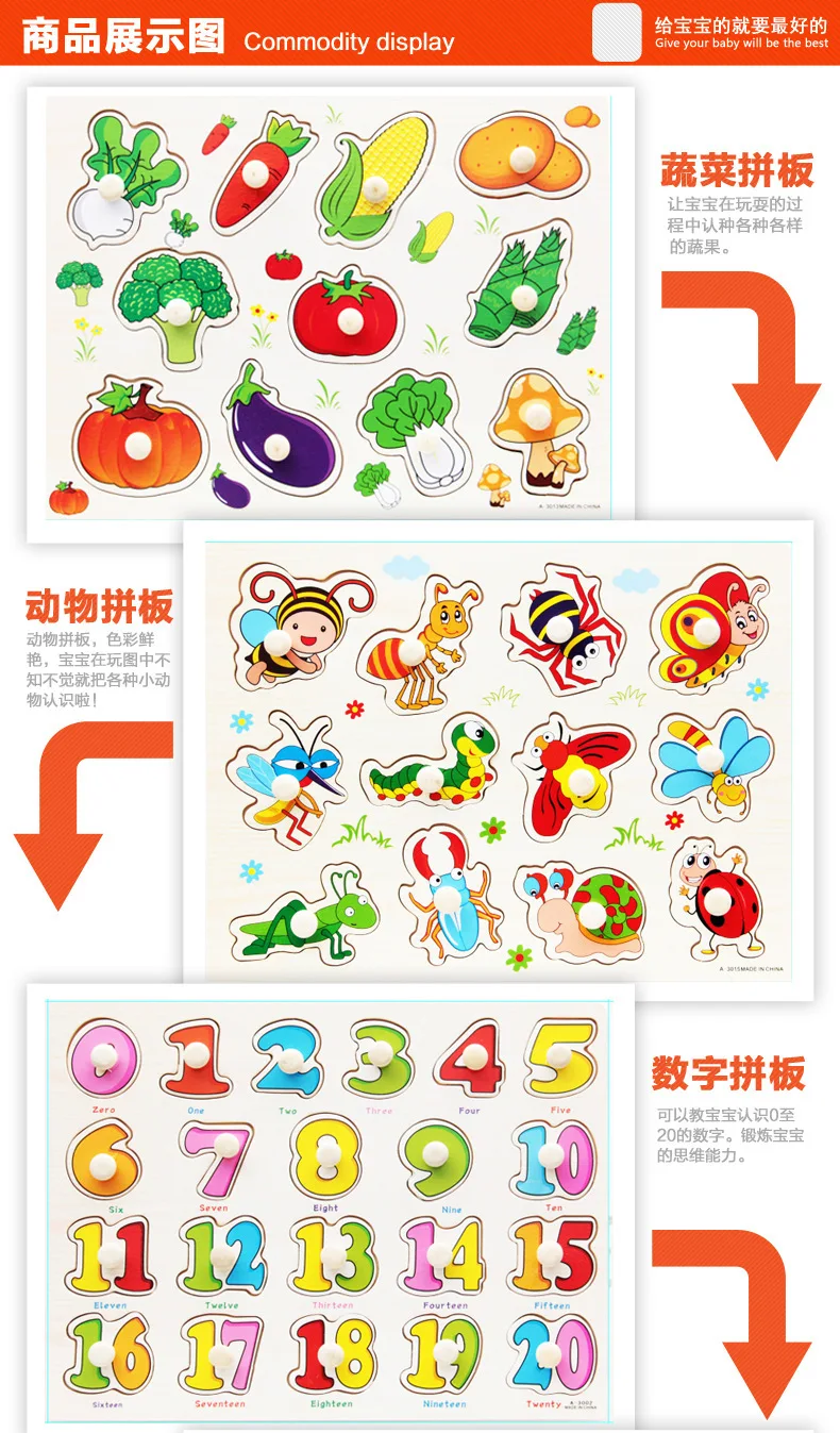 Материал: деревоРазмер: 30*23 смВес: около 0,25 кгМетод упаковки: OPPПодходящий возраст: 1 год +Образовательные цели: дайте ребенку знать цвет и форму различных фруктов и овощей и т. Д.; Развивайте способность наблюдения ребенка и способность к координации рук и глаз; Пусть ребенок тренируется инкрустацией, научитесь находить одно-на-одном соответствие.Метод игры:Откройте ручки и возьмите маленькие ногти одной рукой и снимите их. Поместите их один за другим на соответствующую картинку.