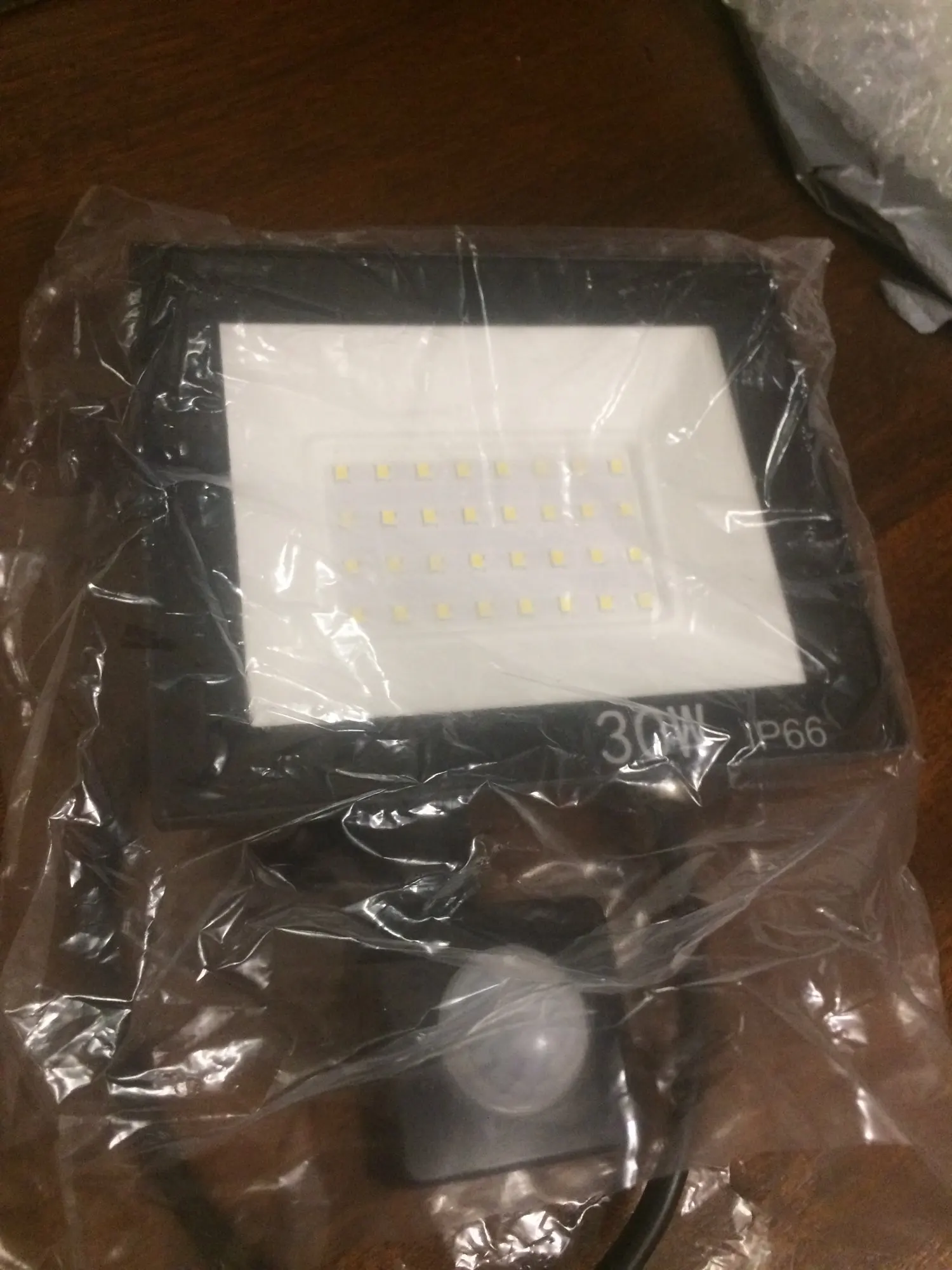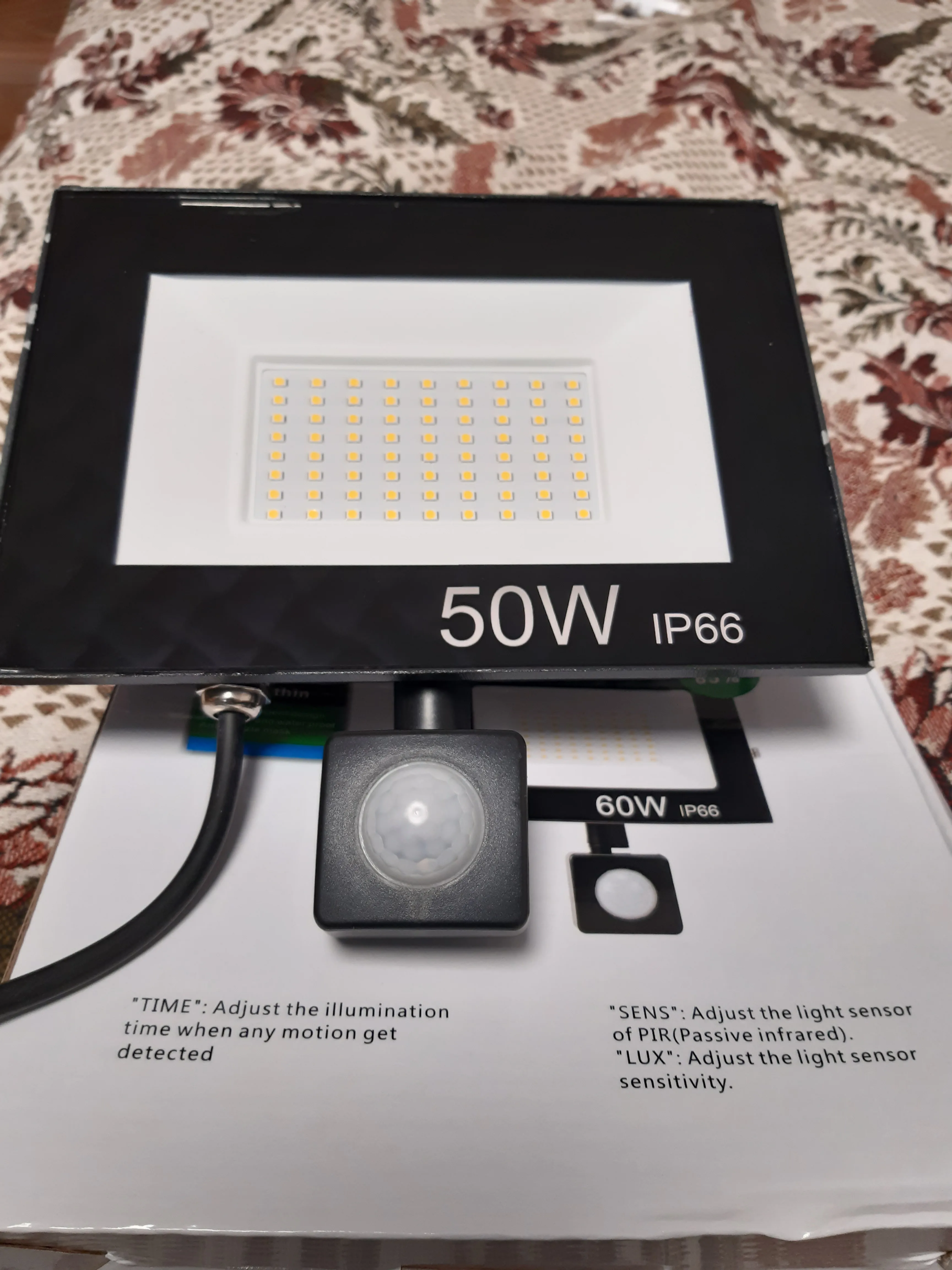 Пришел в целости, но, к сожалению, работает только датчик движения и не работает датчик освещенности! 50 ватт светит очень ярко. Жаль, что не все функции смогу использовать(