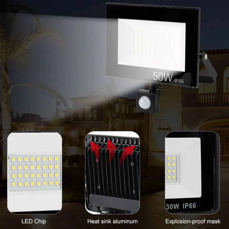 Датчик движения, светодиодный прожексветильник 10 Вт, 30 Вт, 50 Вт, наружный прожектор 220 В, 240 в, водонепроницаемый светодиодный прожсветильник для сада, стены, улицы