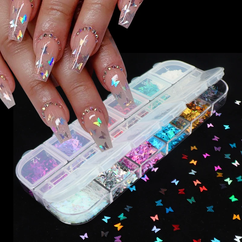 12 сеток 3D ультра тонкие блестки в форме бабочки для дизайна ногтей блестящие хлопья Смешанные Мини блестки 123 мм блестящие DIY украшения для ногтей