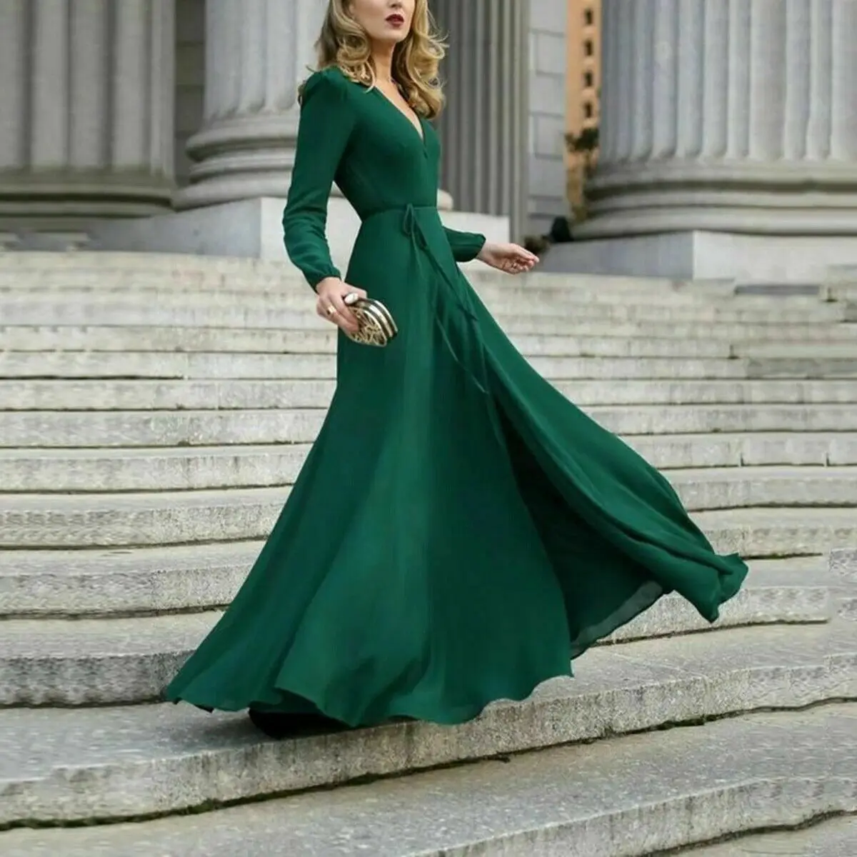 Женское длинное вечернее платье, с глубоким V-образным вырезом и кулиской на талии, элегантное облегающее платье с длинным рукавом, расклешенное платье для выпускного вечера