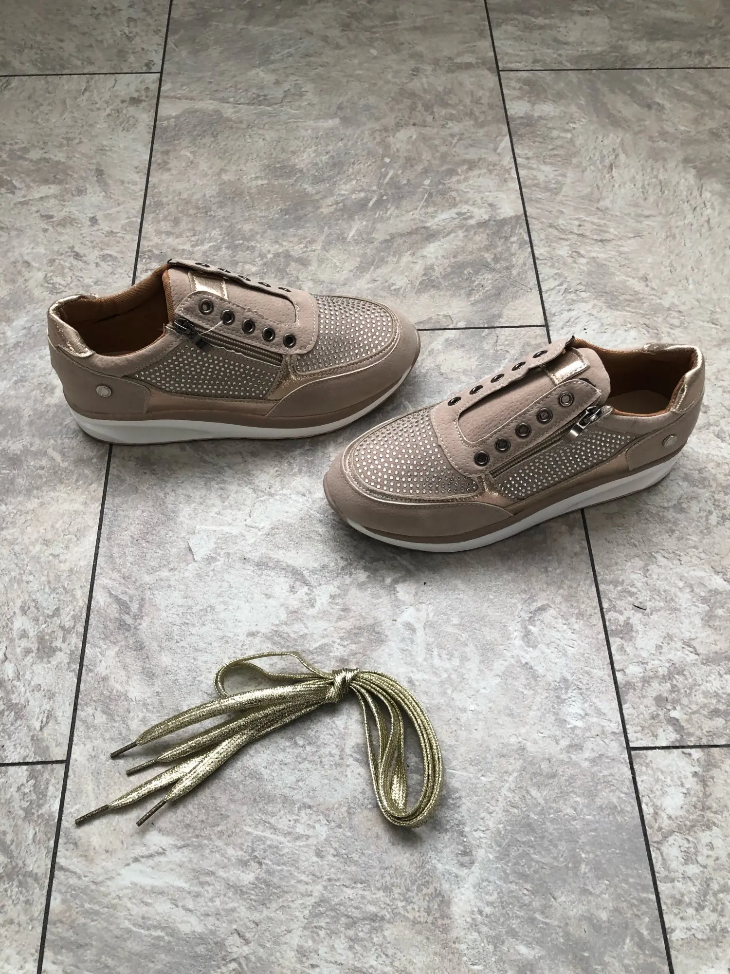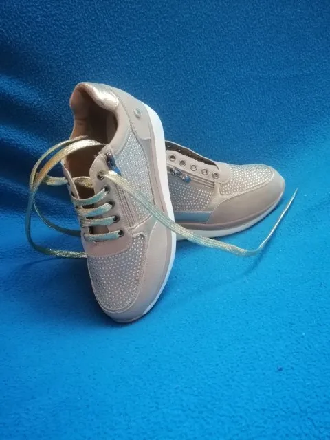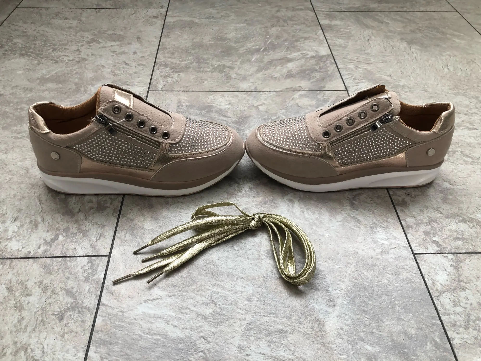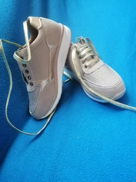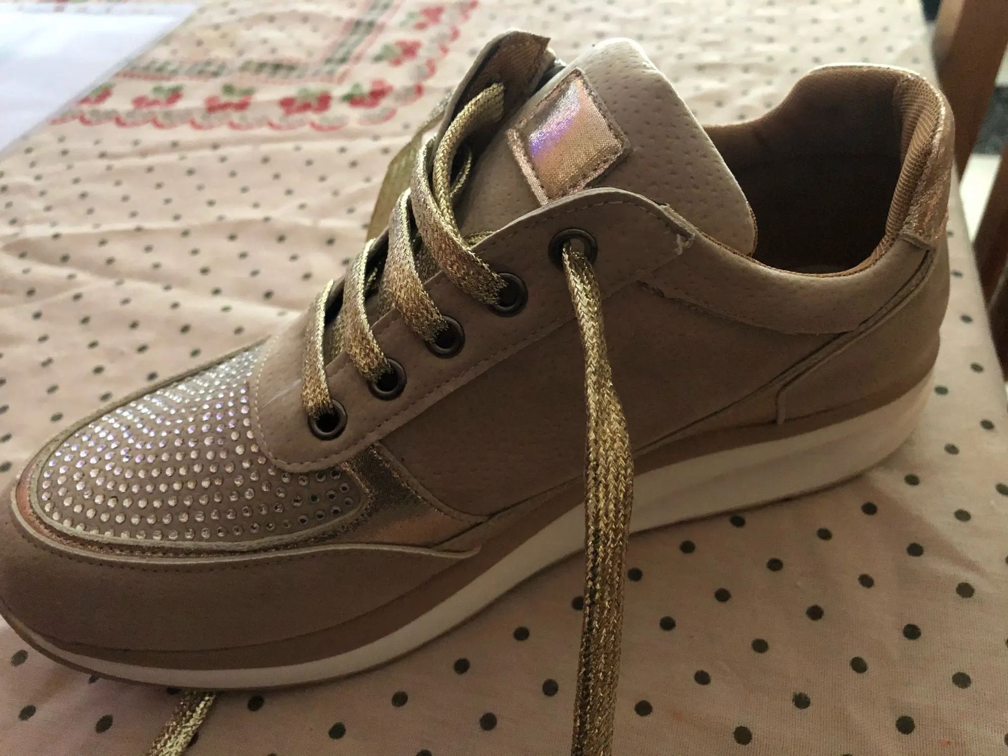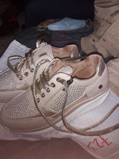 Красивая обувь. Украшена стразами, блестящие шнурки. Очень быстрая доставка. Качество, похоже, соразмерно цене.