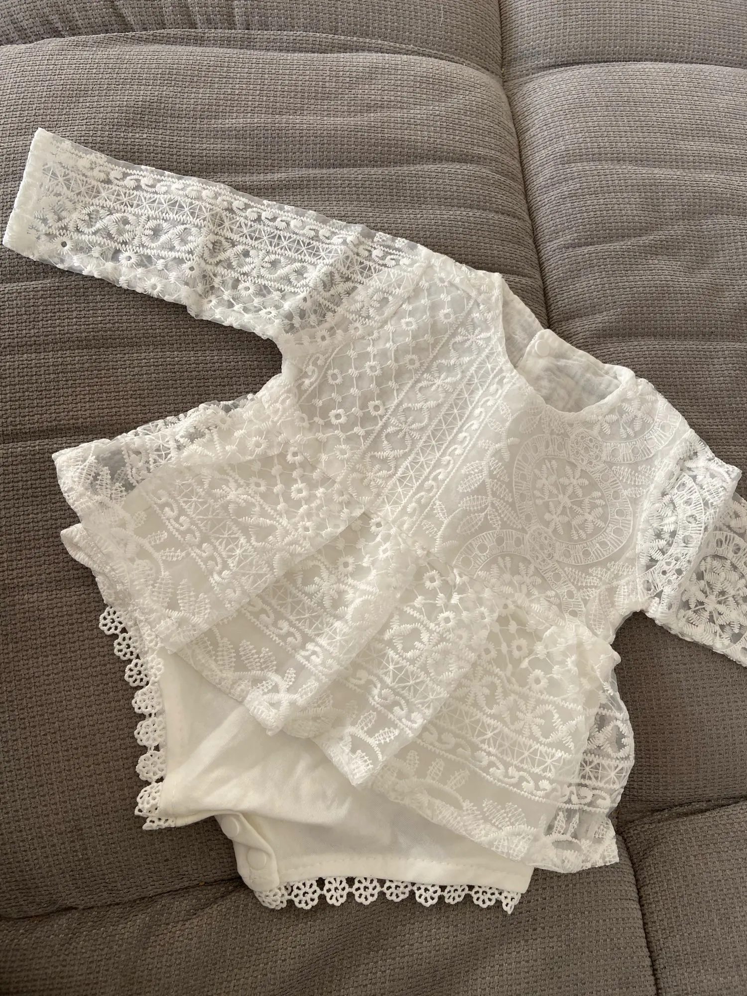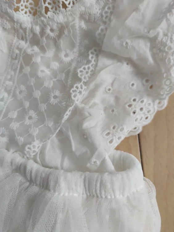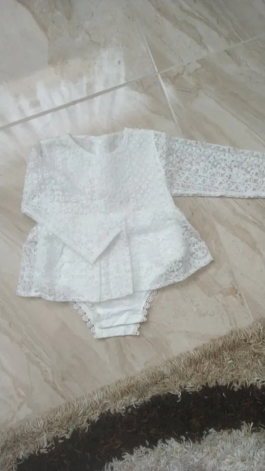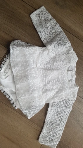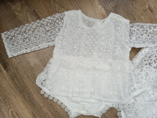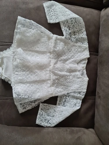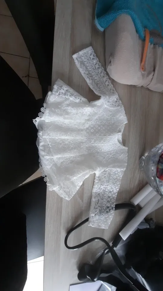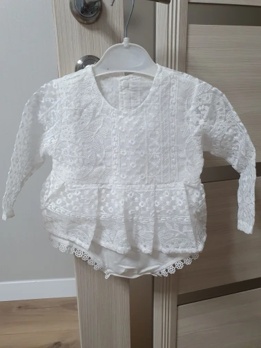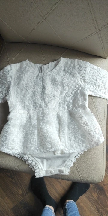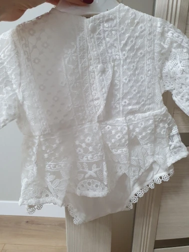 Очень красиво, выглядит элегантно, хорошее качество, без завязок, очень хорошо приготовлено, он просвечивается только на руках кружевом, но его можно использовать с Боди и колготками или без ничего. Пуговицы из пластика, но цвет такой же, как на ткани, поэтому они остаются незамеченными. Мне понравилось, я заказал 24 месяца на мой 11-месячный bb, он становится свободным и очень красивым.