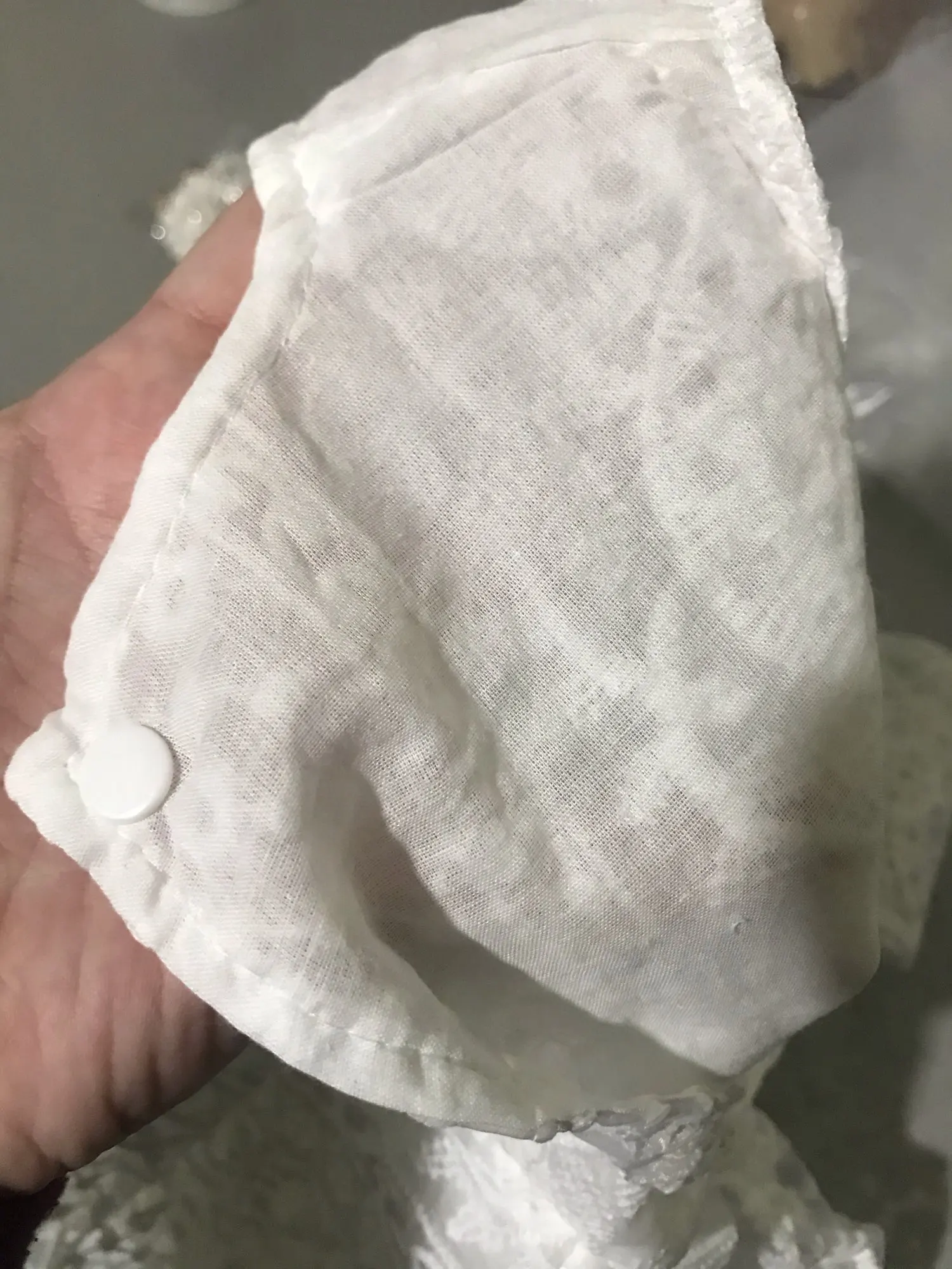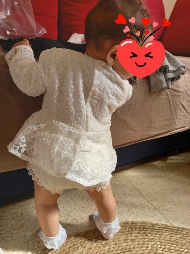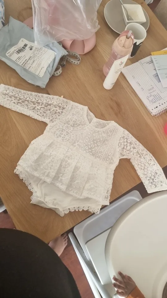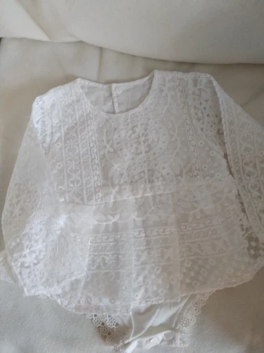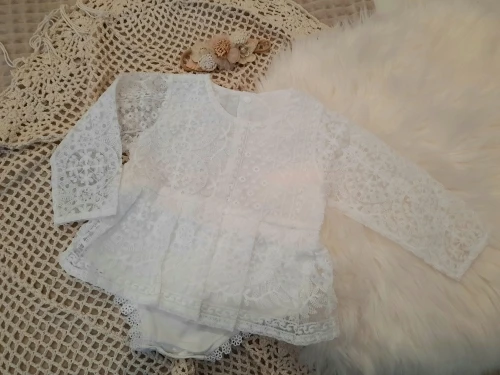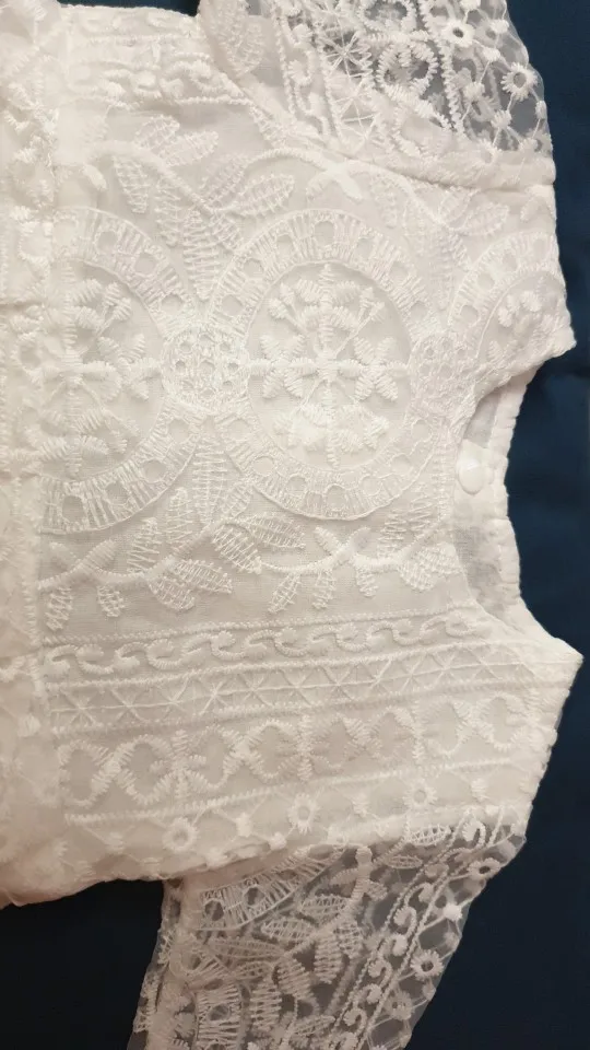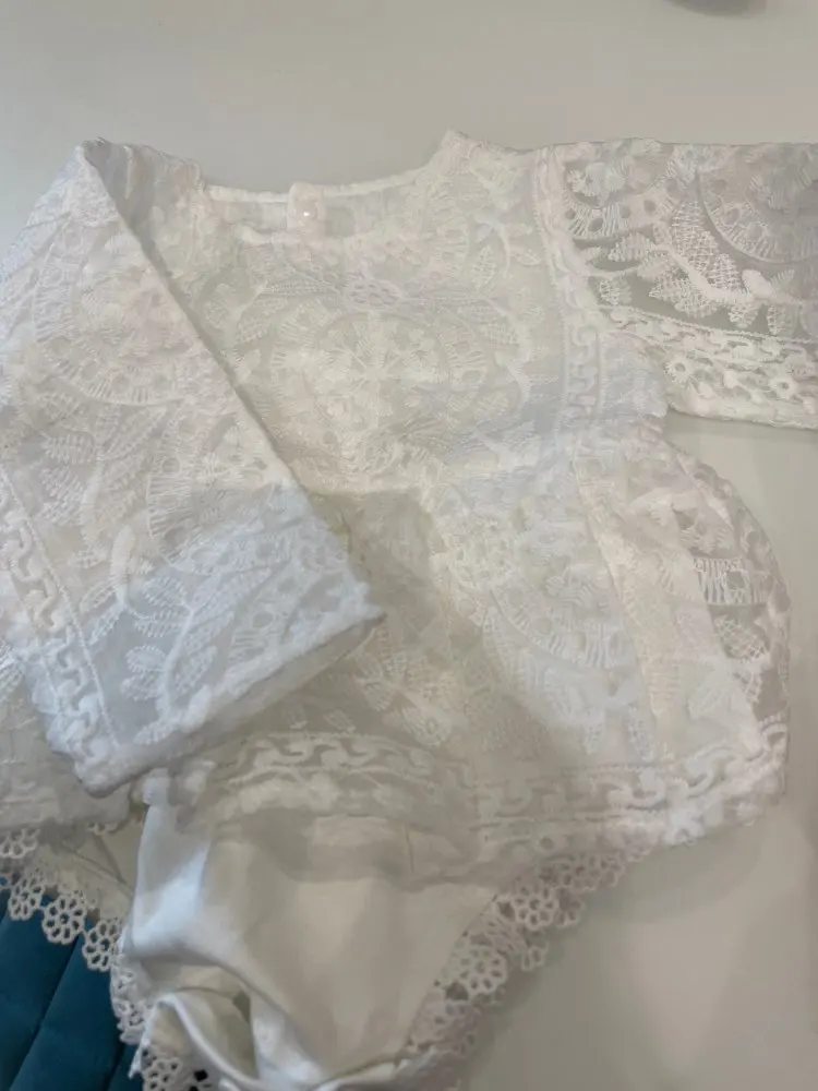 Очень красиво, выглядит элегантно, хорошее качество, без завязок, очень хорошо приготовлено, он просвечивается только на руках кружевом, но его можно использовать с Боди и колготками или без ничего. Пуговицы из пластика, но цвет такой же, как на ткани, поэтому они остаются незамеченными. Мне понравилось, я заказал 24 месяца на мой 11-месячный bb, он становится свободным и очень красивым.