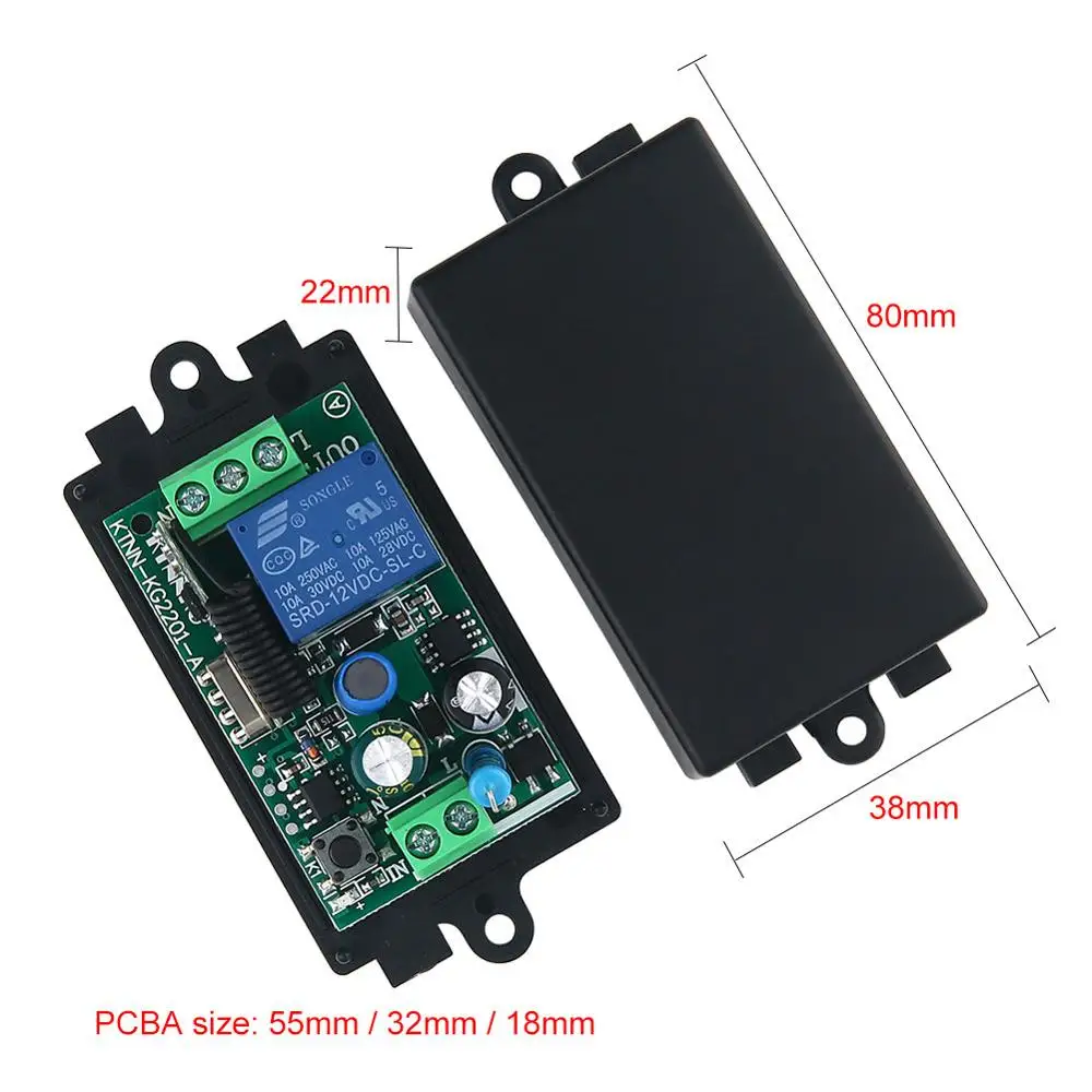 1. Рабочее напряжение: 90-250 В переменного тока2. Ток покоя: 8 мА3, рабочая частота: 433 МГц4, мощность нагрузки: 10 А5. Чувствительность приема: -105 дБм6, отклонение частоты: ± 0,2 МГц7. Метод кодирования: тип обучения8. Режим работы: бег, самоблокировка, блокировка9. Метод модуляции: ASK10, расстояние дистанционного управления: 30 м (дикий)11, размер PCBA: 65,2 мм * 35,5 мм * 18 мм12, Размер корпуса: 85 мм * 40 мм * 25 мм