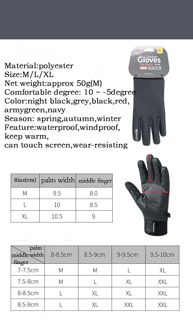 Характеристики: сенсорный экран LOYCAR, водонепроницаемый, ветрозащитный, сохраняющий тепло материал, не скользит