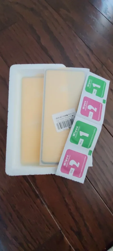 Стекло хорошее, единственный минус обе салфетки сухие, размер салфеток 2х2 см.