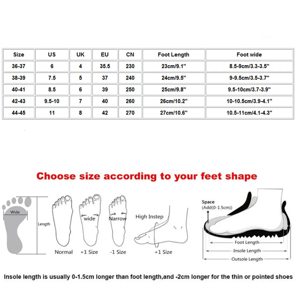 Полезные советы:Различные стили обуви, пожалуйста, выберите размер в соответствии с типом вашей стопы