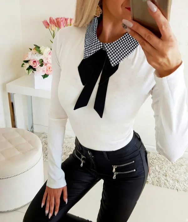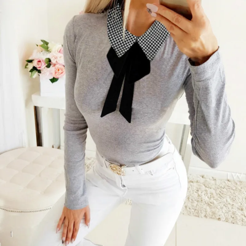 Сексуальные топы, элегантная рубашка с длинным рукавом, женская рубашка, однотонный отложной воротник, бант, длинный рукав, облегающая женская блузка